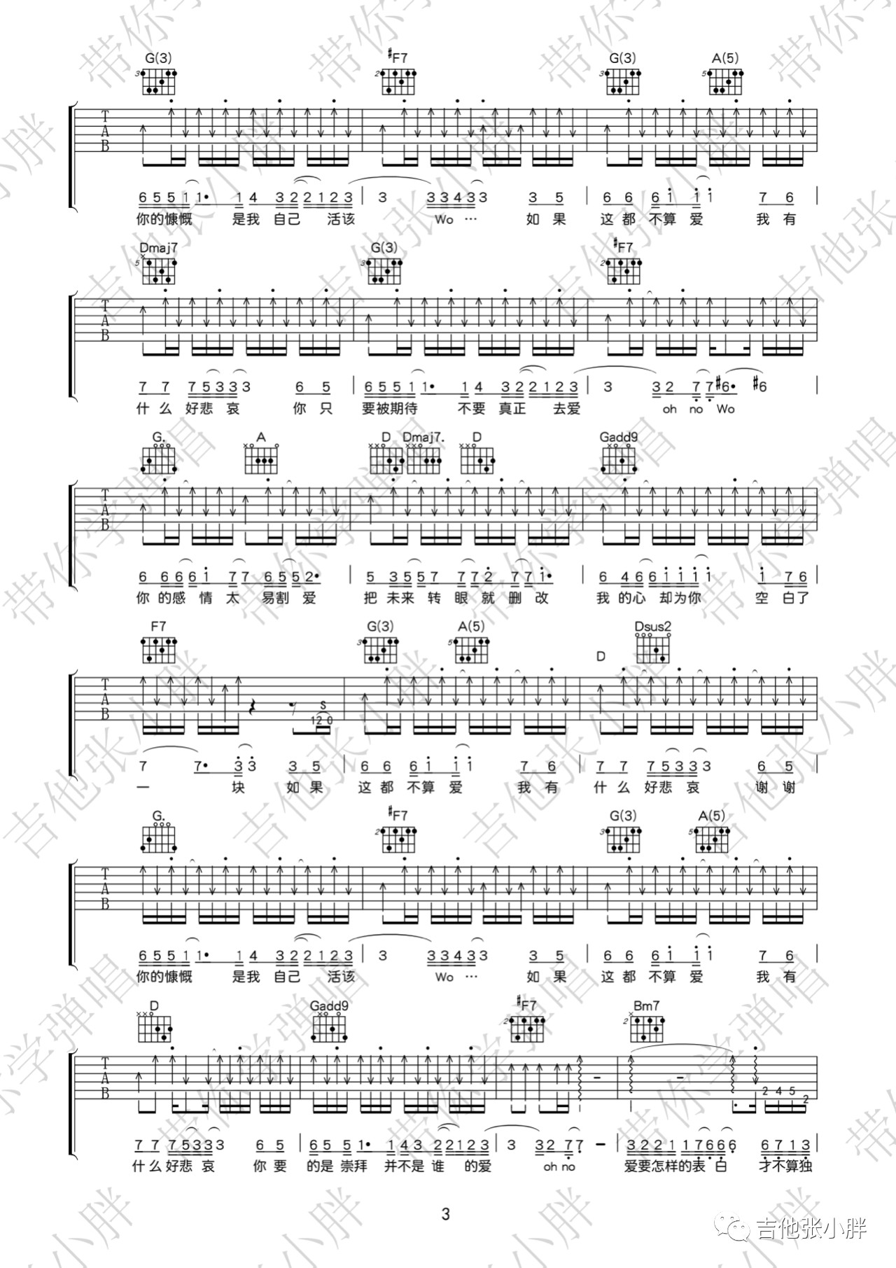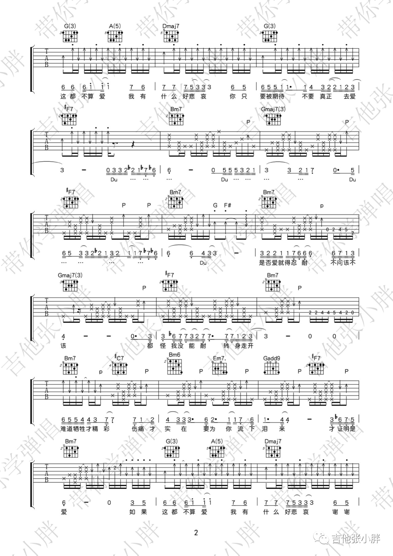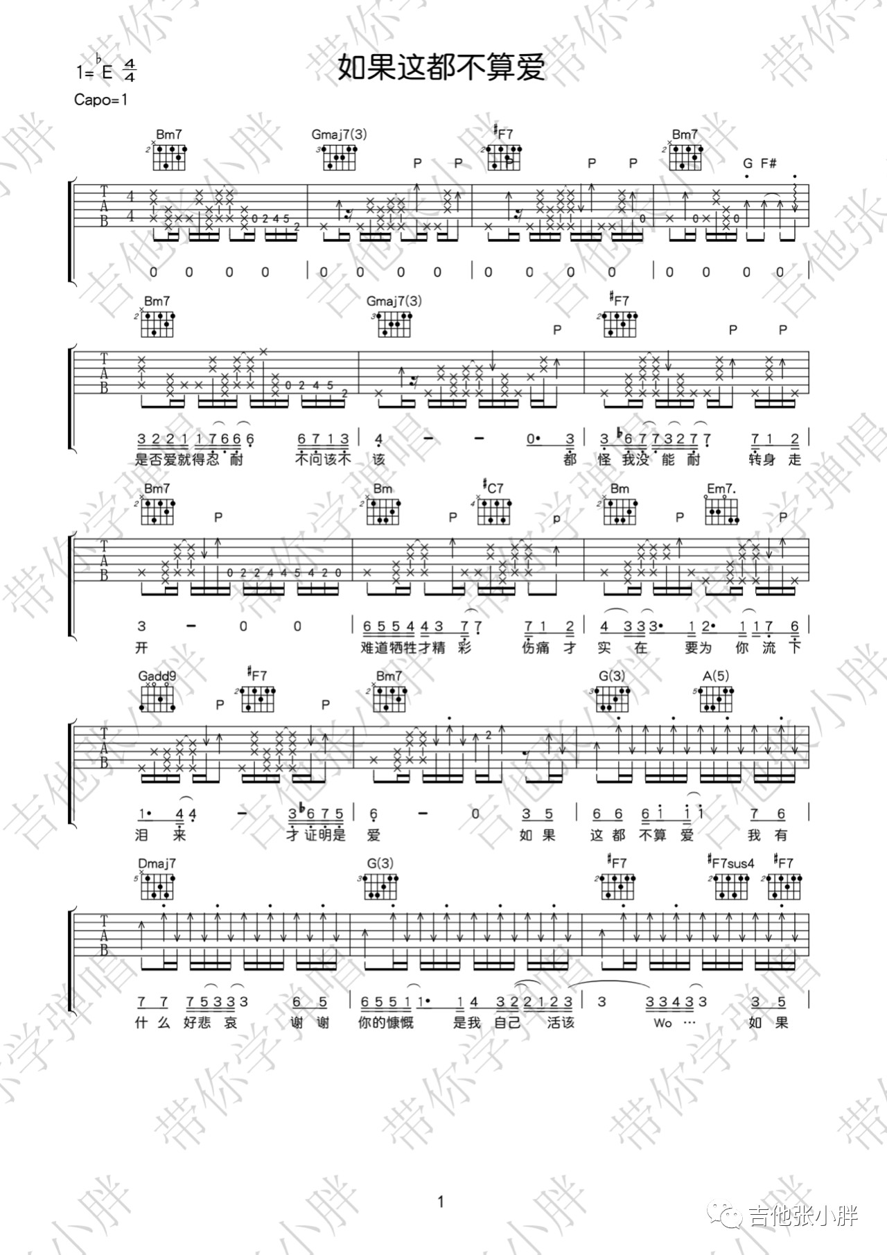 曲谱介绍: 如果这都不算爱吉他谱,张学友演唱经典老歌,来自张小胖编配吉他弹唱谱,D调指法编配,原调bE调,大家可以变调夹夹第一品。演奏上用到了很多切音、拍弦加制音的节奏,和弦也比较难,适合有基础的琴友。爱过的心没有任何请求,走过的路再也不能停留。张学友《如果这都不算爱》,从情窦初开到爱意满怀,从耳鬓厮磨到心如刀割,张学友的情歌唱尽了爱情百味。如果这都不算爱,到底什么才是爱?