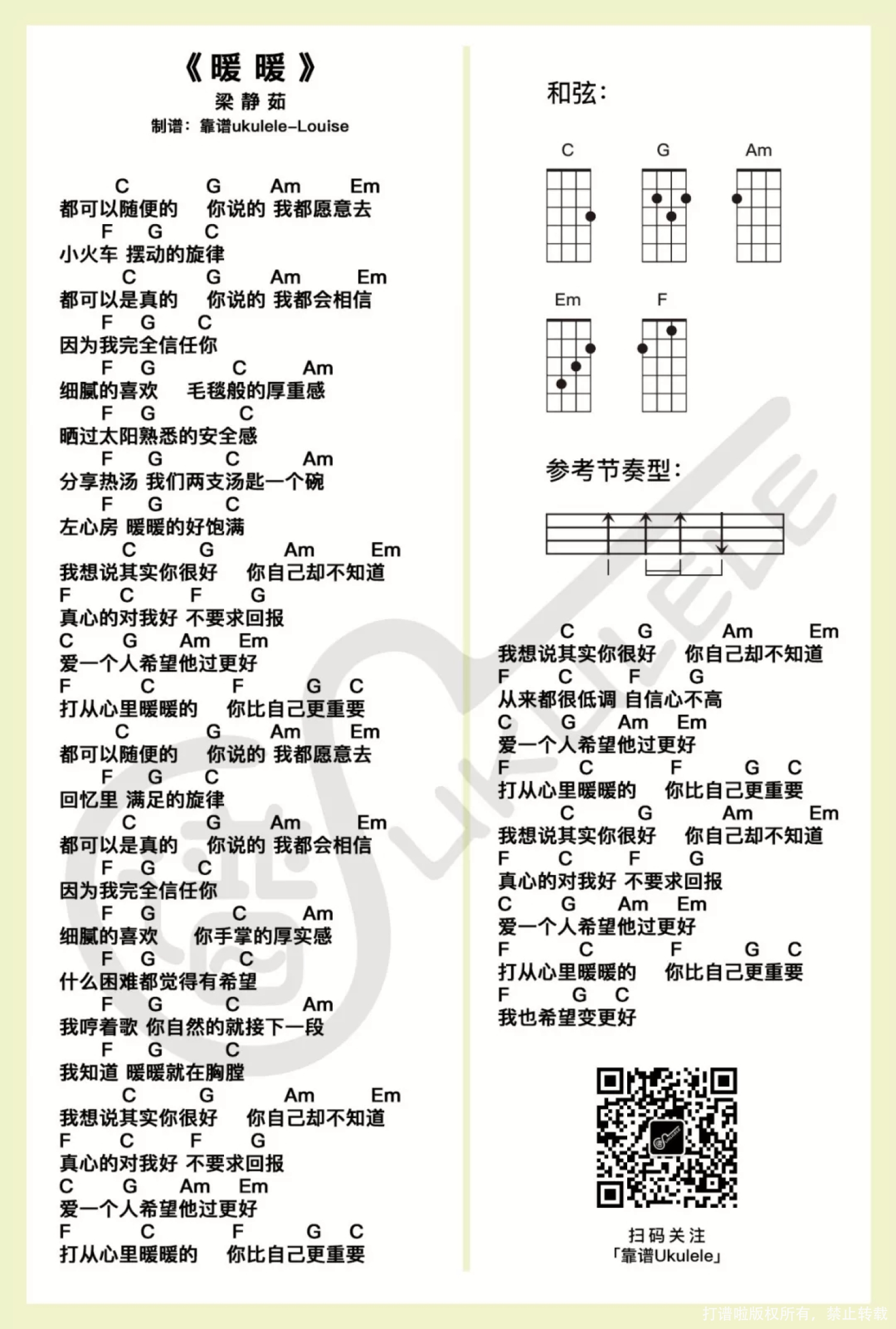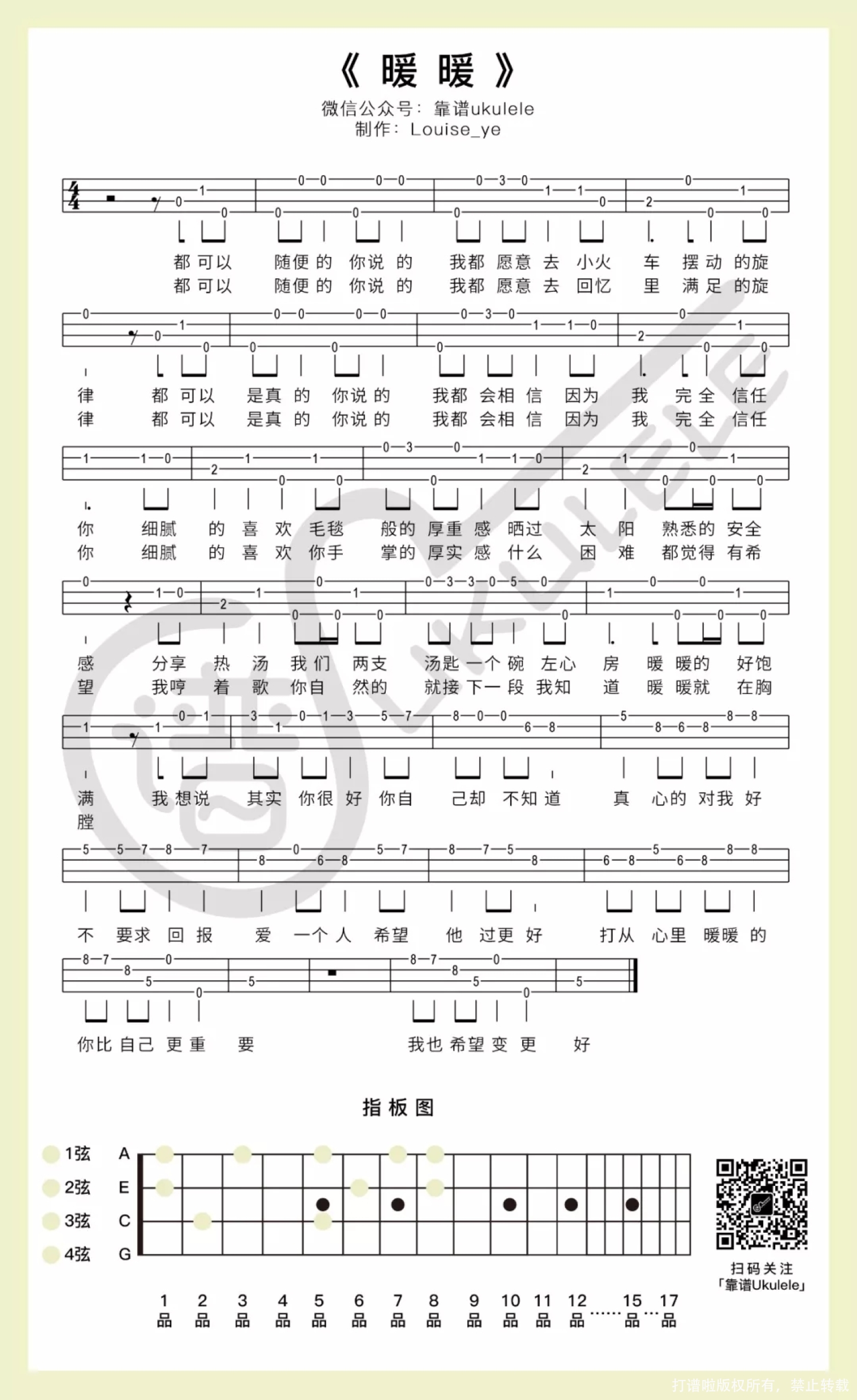 曲谱介绍: 这首歌算是比较早我自学时候练习的一首歌,当时看的是Lele(麗麗卡拉ok)的教学视频,清楚的记得Lele是在台湾一个叫暖暖的站台上录制的,可能是因为很少看到这样的车站吧,之前去台湾旅游的时候也到过一些类似的车站走过,还挺喜欢那种感觉的。 相信总有那么一个人当你想起他/她的时候,心里总是暖暖的、甜甜的。爱情里「你说的,我都会相信……」没有任何的猜疑,彼此信任;两个人在一起「我哼着歌,你自然的就接下一段……」这样的一瞬间是不是满满的甜蜜,那种理想爱情相处时出现的点点滴滴大概都被写进了歌吧…… MV里那个站台的感觉是不是还蛮朴实的,很多游客会去打卡的地方,虽然之前没有去暖暖站打卡,但有去过一个地方放过天灯好像是十份的样子?(时间有点久,记不太清了……),很巧的是在特定时间里看到了古早火车经过,也算是去对了时间,好像放天灯的老板说很多游客去错了时间都没看到火车经过的样子呢~   暖暖尤克里里弹唱谱 难度系数:★ 既然说了这首是我自学时候学的歌,就是我觉得难度不太大的啦(当然,跟我喜欢这首歌是很有关系的,熟悉的歌好上手!新手一定要记得,选这样的歌对练习是比较好的)。 节奏型的部分口诀:(下~下下上)。   暖暖尤克里里指弹谱 难度系数:★☆ 这首歌是算比较容易弹的了,旋律比较简单,已经移调到了最容易的版本,空弦音很多(我个人喜欢的哈哈哈哈),指法的部分没有什么难,相信节奏上也是比较不容易出错的。 还等什么呢?试试看呗~!