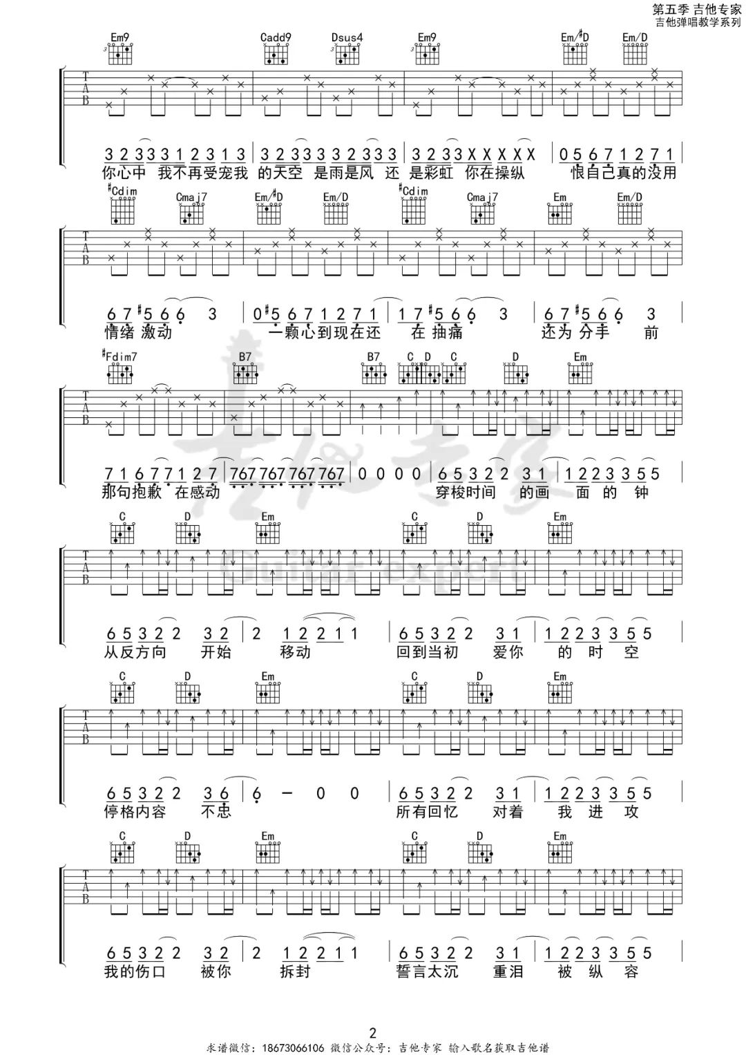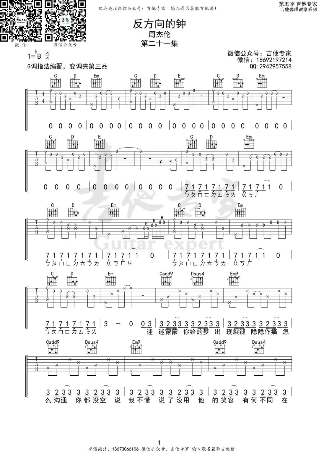 曲谱介绍: 反方向的钟吉他谱,来自吉他专家编配吉他谱,G调指法编配弹唱谱,变调夹夹第三品弹唱,原调bB调,共三张图片谱例,演奏上基本上没什么特别复杂的地方,整体难度一般。周杰伦《反方向的钟》,整首歌的和弦虽然不多,却有很强的代入感,像是在翻阅一册满载着回忆的旧相册,穿梭时间的画面回到当初的时空。