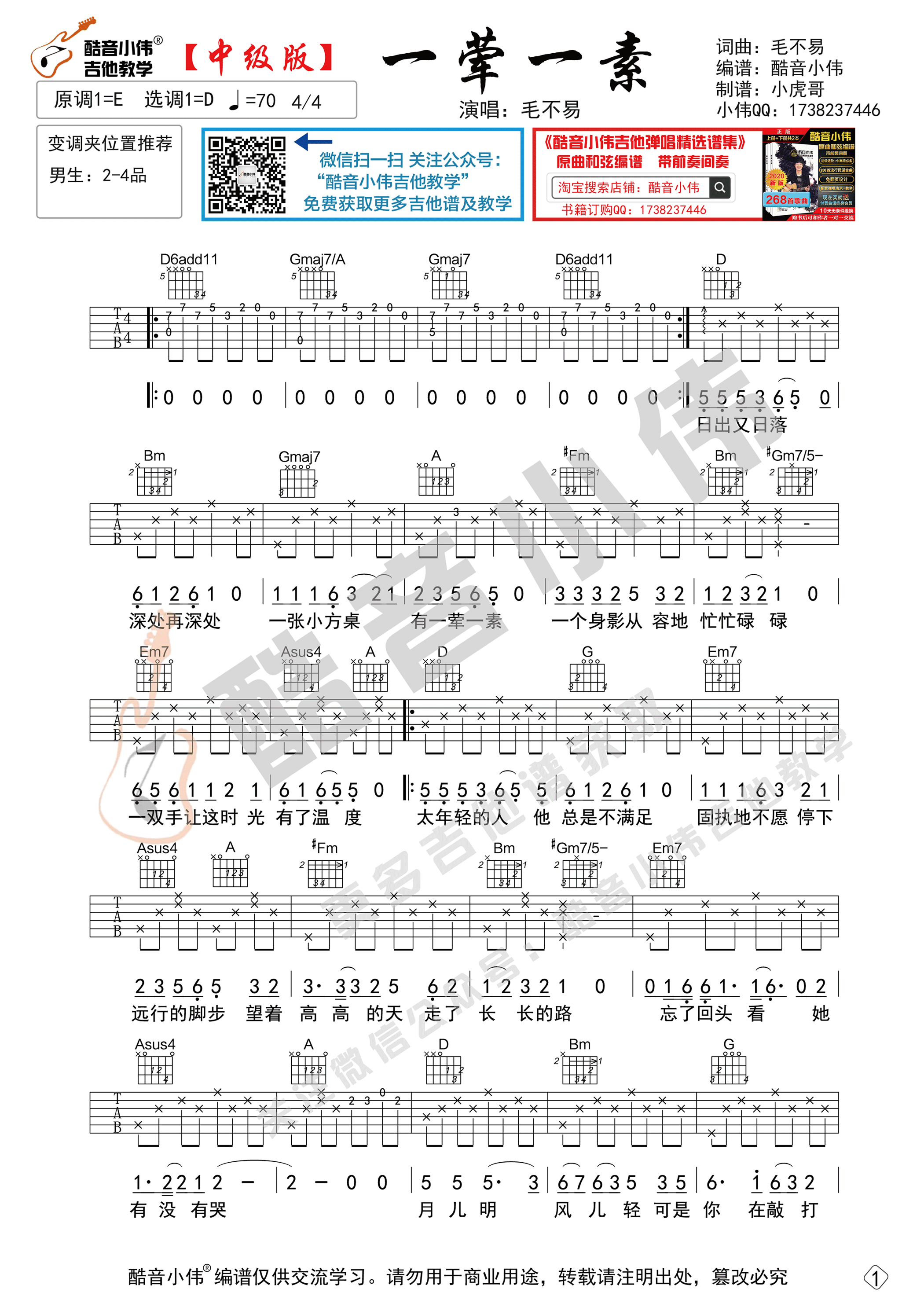 曲谱介绍: 一荤一素吉他谱,毛不易演唱走心歌曲,来自酷音小伟编配。吉他谱采用D调指法编配,速度大概每分钟70拍左右,适合男生弹唱,推荐变调夹夹2-4品。歌曲的前奏间奏部分稍微难一些,附弹唱演示音频,共大家弹唱对照。 酷音小伟 毛不易《一荤一素》,这是毛不易写给母亲的一首歌。没有一句在说母爱,却句句都在说母爱。质朴的浅吟低唱,勾勒出千千万万个人世间的烟火家常,也诉尽了思念。