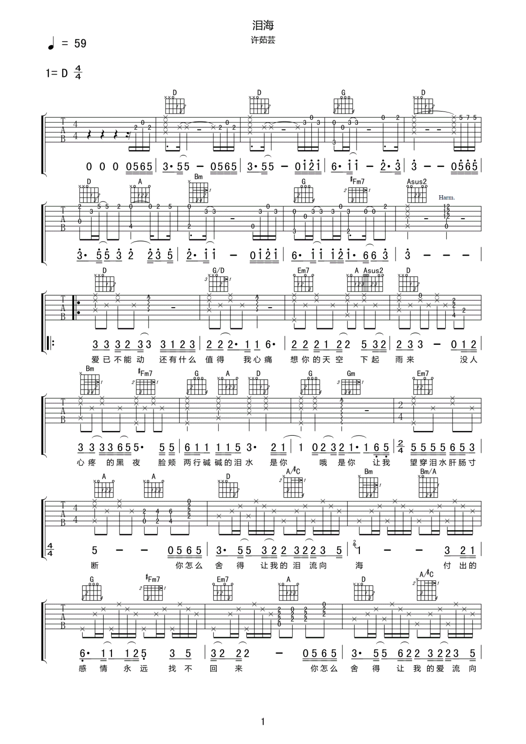 泪海吉他谱 - 许茹芸 - D调吉他弹唱谱 - 原版