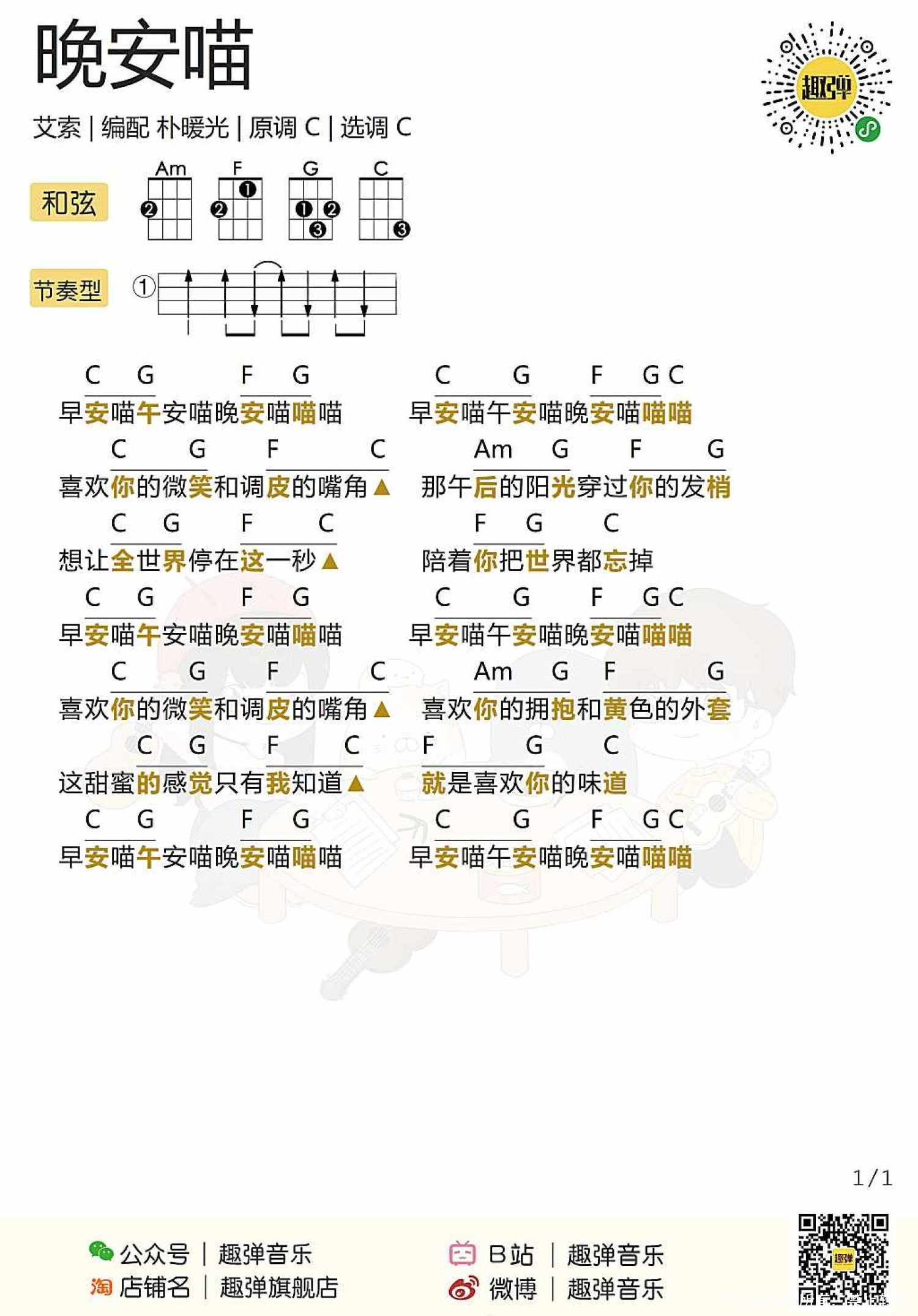 曲谱介绍: Aloha~ 今天要给大家推荐一首 超超超cute的歌! 艾索演唱的「晚安喵」 这首可以说是喵控必备了! 趣酱云吸猫的时候 经常能看到大家用它当BGM   晚安喵ukulele谱