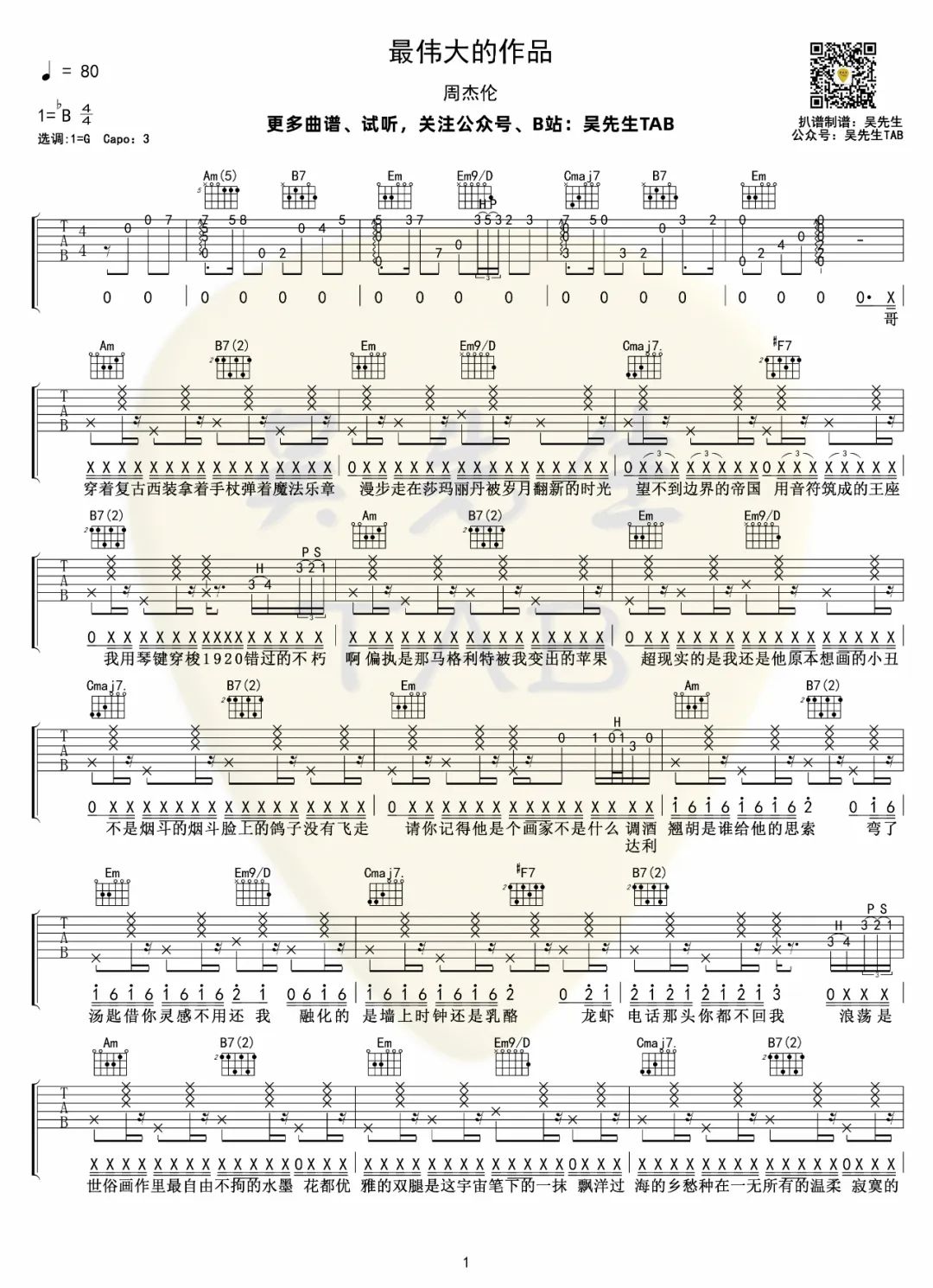 曲谱介绍: 最伟大的作品吉他谱,来自吴先生编配版弹唱六线谱,G调和弦指法编配,变调夹夹第三品弹唱,演奏速度每分钟80拍,附弹唱音频试听。 吴先生 世代的狂,音乐的王,万物的臣服。琴键的速度,旋律的渴望,我的音符是未来艺术的觉醒。生命中曾经有过的所有灿烂,终究都需要用寂寞来偿还。成就最伟大的作品,却也习惯了与孤独为伍。这世上的热闹,都出自孤单。