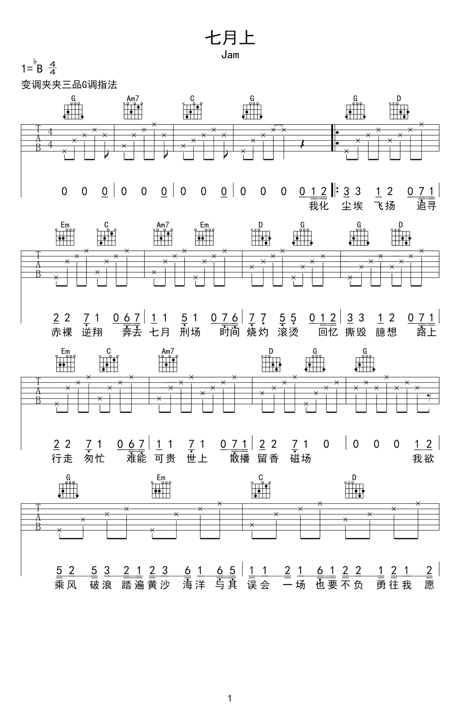 七月上吉他谱 - JAM - G调吉他弹唱谱