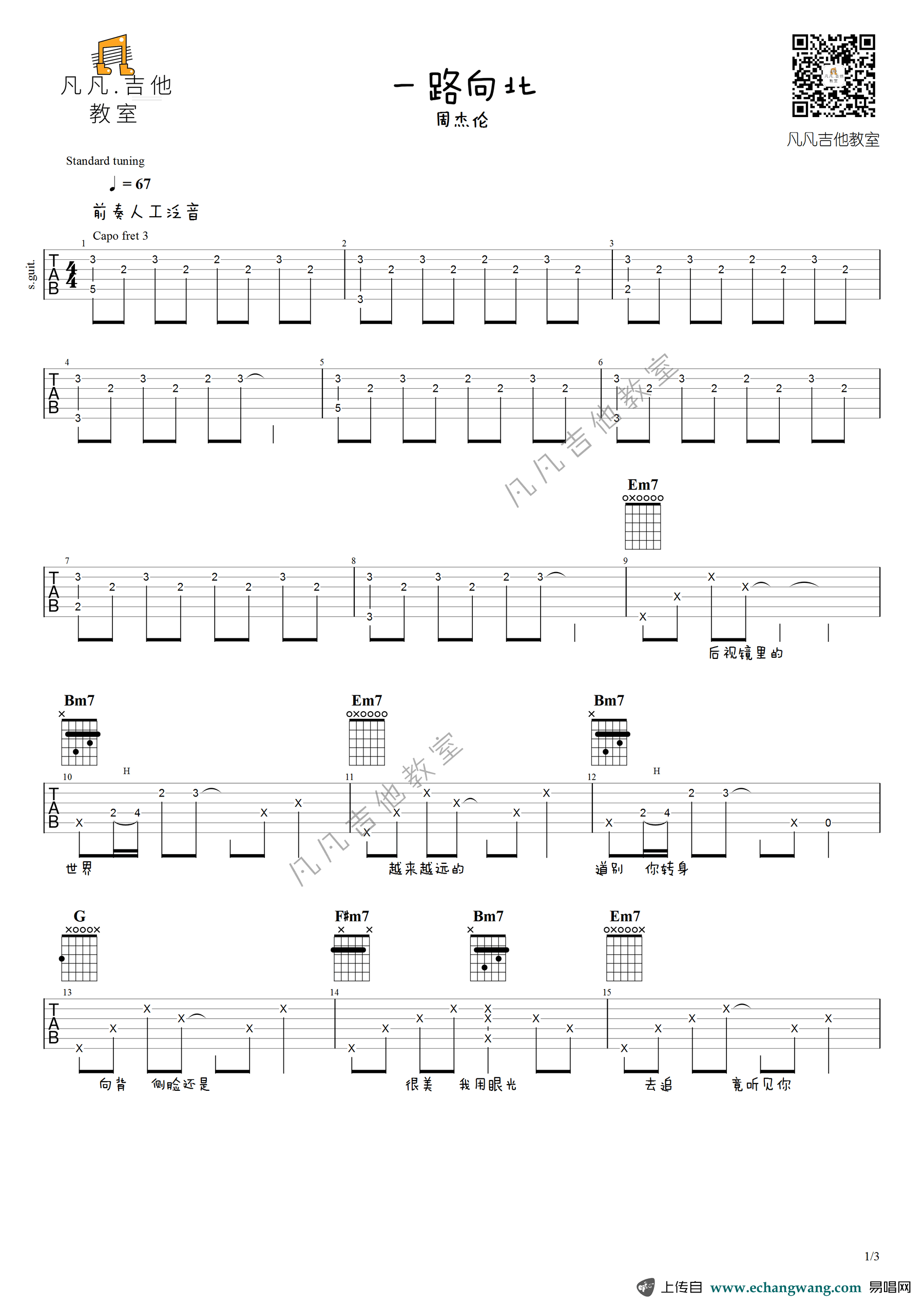 曲谱介绍: 周杰伦演唱的一首歌曲,4/4拍的节奏,这首歌曲的原调为F调,这里曲谱采用了D调指法进行编配,演唱时夹变调夹3品可回到原调,也可根据个人实际嗓音情况选择。曲谱由琴谱网更新上传,来源于@凡凡吉他教室编配出品。前奏带有唯美的基调,整首歌哀伤淡淡变化不多。每当听到这首歌,就会想起电影《头文字D》中周杰伦边开车边流泪的场景。  吉他弹唱演示及视频教学