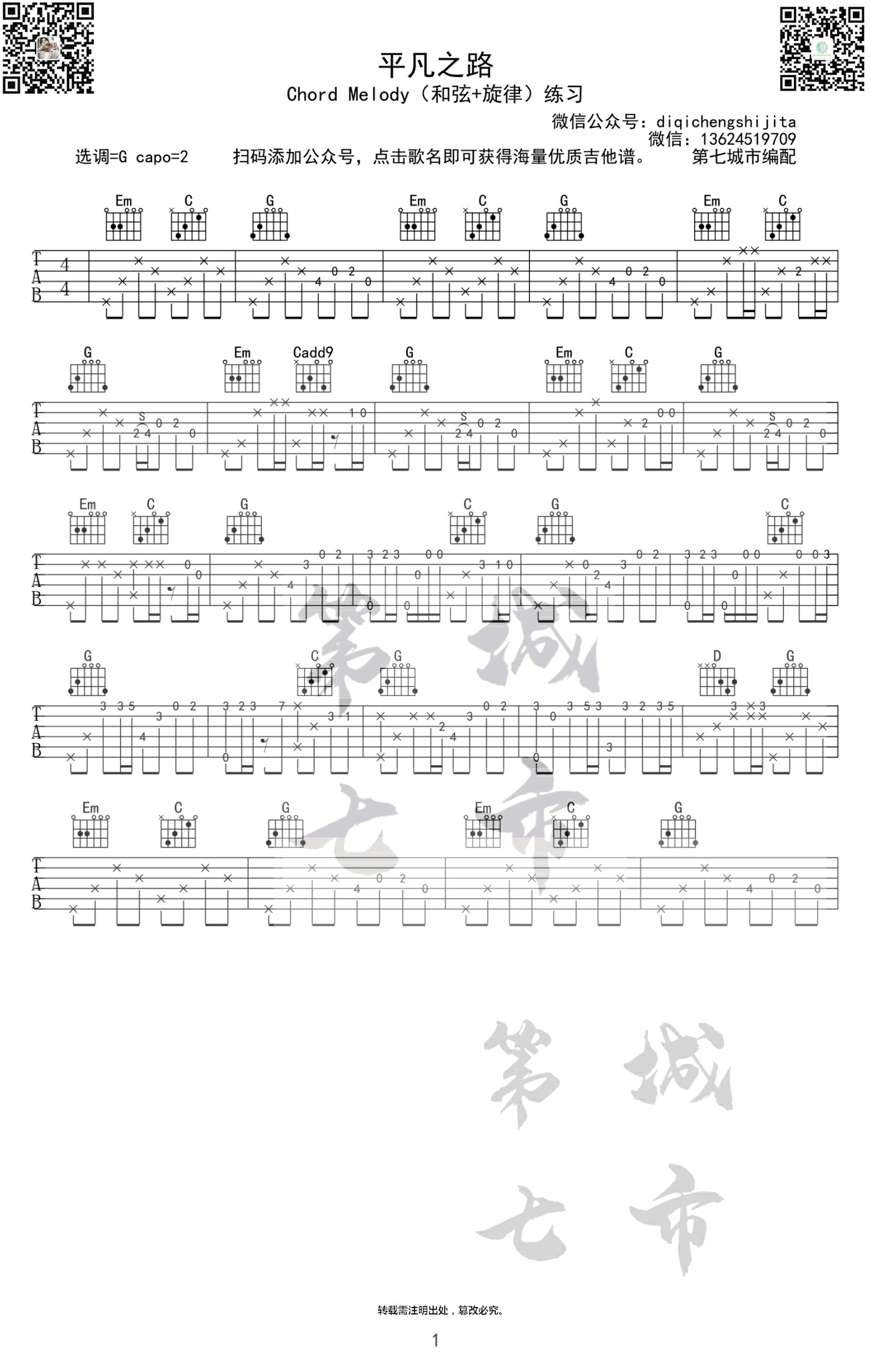 曲谱介绍: 朴树《平凡之路》吉他独奏谱,共有1张高清图谱,免翻页排版设计。