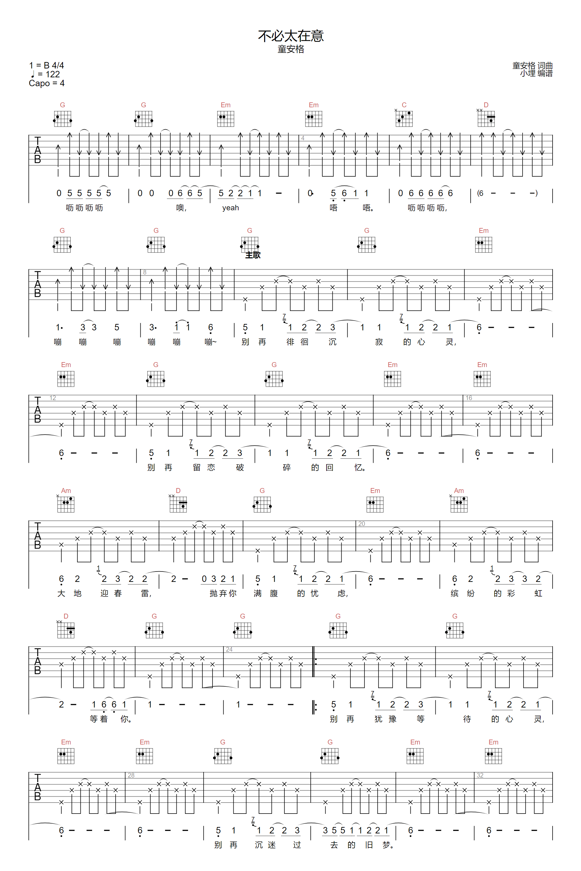 不必太在意吉他谱 - 童安格 - G调吉他弹唱谱