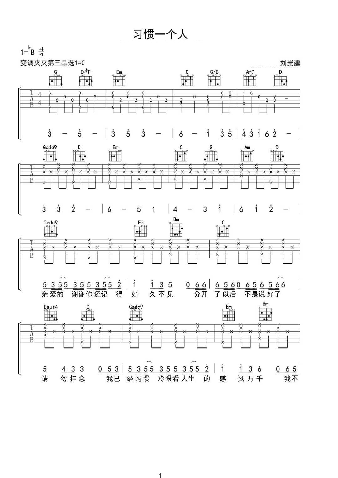 习惯一个人吉他谱 - 刘崇建 - G调吉他弹唱谱 - 原版