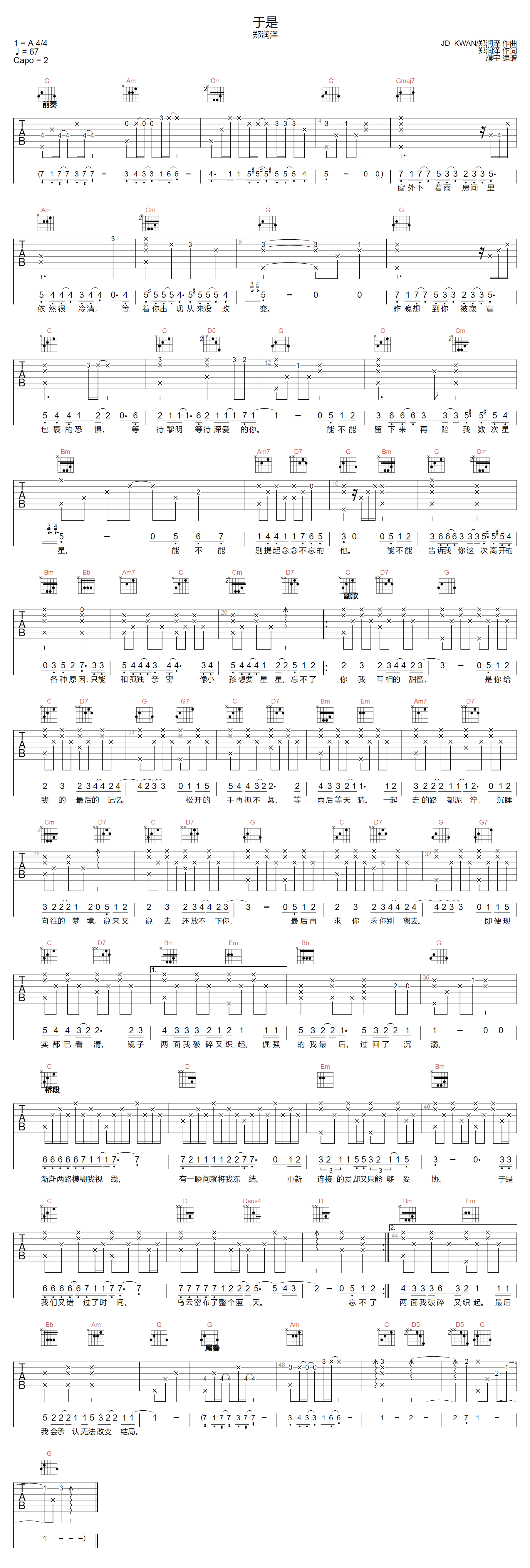曲谱介绍: 郑润泽演唱的一首歌曲,4/4拍的节奏,这首歌曲的原调为A调,这里曲谱采用了G调指法进行编配,演唱时夹变调夹2品可回到原调,也可根据个人实际嗓音情况选择。曲谱由琴谱网更新上传,来源于@濮宇编配出品。