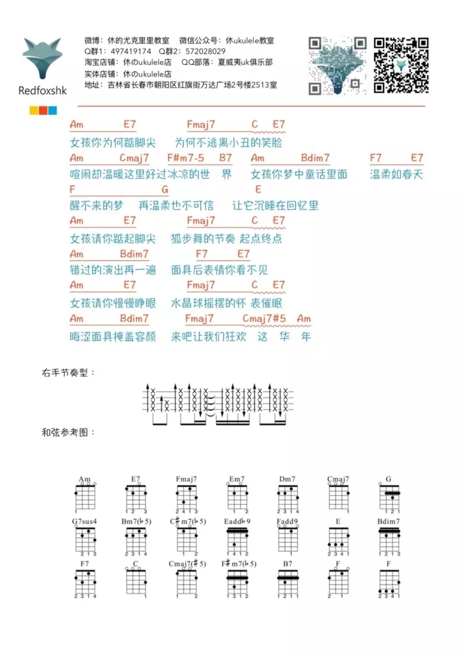《女孩你为何踮脚尖》ukulele视频演示 《女孩你为何踮脚尖》ukulele曲谱 本来一直想做《达拉崩吧》,正要准备扒谱子时猛然看见《趣弹》已经将MV做好,然后顺道欣赏了一下他们的MV,简直不能再棒。沿着洛天依就寻找到了这首歌。歌曲曲风在流行音乐中属于前卫,整体阴暗、诡异的风格,第一次听就被深深吸引,是一首绝佳的节点总结曲。从去年到现在接触尤克里里已经有一年半的时间,从弹唱开始到回归弹唱,中间有一年的时间跑去研究指弹,慢慢的又回到了当初所期望的那样,用和声和技巧来丰富自己的弹唱谱,要弄出不输于其他伴奏乐器的、有情感的曲谱。曾有人问我,你弄的谱子都没人去看,还自我感觉良好,即难又不流行,完全不符合大家的胃口,小白看了完全不能弹。(对于新手玩家来说确实不友好了)。当初我开始弹唱的时候,就苦于找不到好听一点的曲谱,大部分和弦表达的感觉就是敷衍了事,为了简单好上手,去做了很多牺牲。但是简约不等于简单,剩下的不能多说了。。。现在好多大佬们推的谱子质量都是高到飞起,而且还高产。这里不得不深深地佩服。。。 从今年4月份开始找课程学习乐理方面的相关知识,经过了半年的时间,应该有一首歌从和声方面给自己总结一下了。这首歌涉及到很多不常见的和弦,相信小伙伴们看到又是没有朋友系列,这首歌不是为了难而难,是为了还原和贴切。对于并不是专业出身,没有经过系统的指导的我,前进的每一步都是槛,值得庆幸的是还是坚持了下来,完成了心目中的一个小节点。尽管可能在专业大佬们看来这里面还有很多值得改进的地方,但自己还是蛮开心的。公众号分享的这些曲子都是自己喜欢的,本意是分享自己完成谱子之后的那种快乐,不过大家应该感受不到,很少按照大家的要求去弄,完全有点自私了,有一种爱看不看的态度,然后直接导致粉丝数量很低。以后会稍微改变一下方向,在保证质量的前提,多接触接触新的元素,每次看到后台的留言都一脸泪水,要的谱子一个都没有。 不过依然很多人留下,给支持我的人点赞。 好了就说这些吧。。太啰嗦,夸自己费了这么半天!