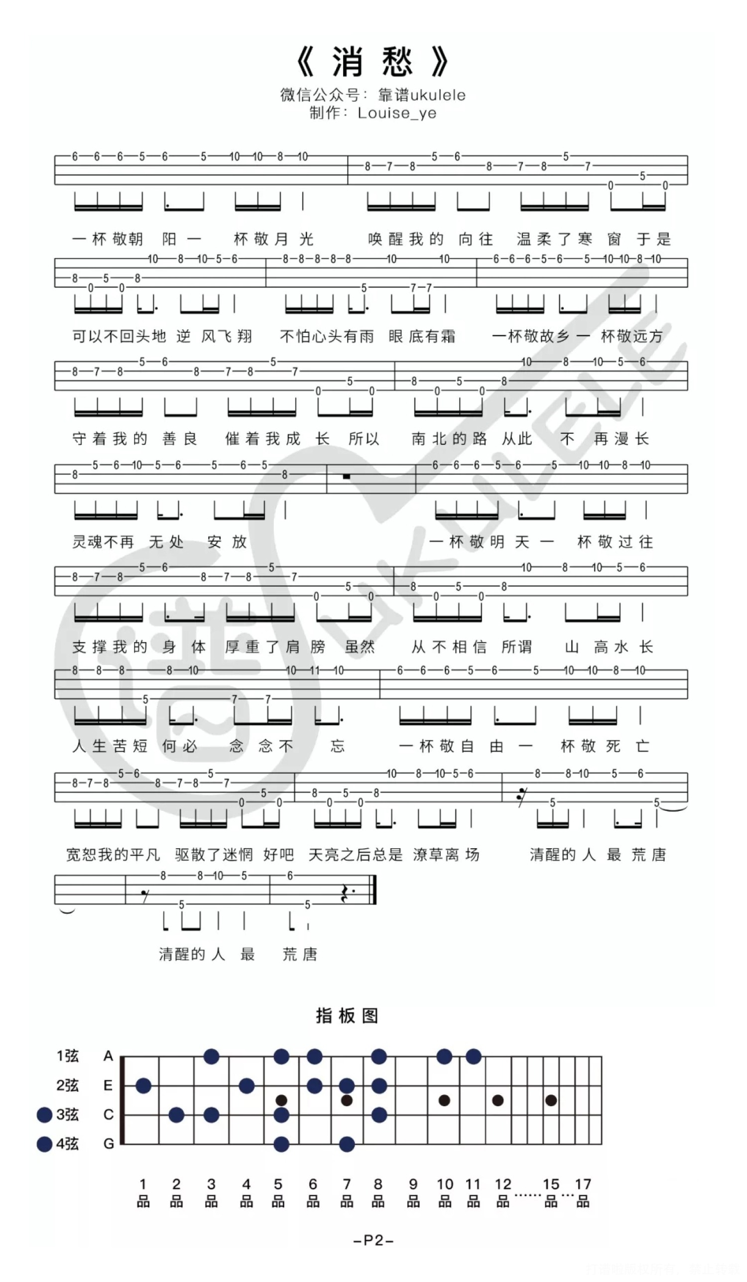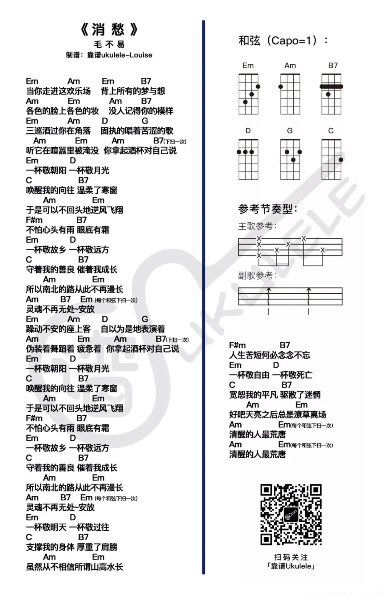 曲谱介绍: 夜深人静的时候,是否会有各种复杂的情绪涌出?毛不易的这首《消愁》,用他慵懒的嗓音引起了很多人的关注,产生了不少共鸣…… 除了副歌外,那一句「清醒的人最荒唐……」,是我个人比较喜欢的。其实人也不必什么时候都那么清醒,该犯傻的时候犯傻,弄不明白的事情就糊涂一些不是也挺好的吗?长大后的世界不再只有单纯的快乐,更多的是面对生活需要扛着走的压力,所以让我们在这样的生活中清楚做事,糊涂做人吧…… 难度系数:★★ 这首副歌的部分不是那么好弹了,打谱的时候由于不是很熟的关系,手指头都感觉僵硬的不行……一段一段的衔接不是那么顺(这是我打谱边练时候,差不多就能想象你们刚开始练这个谱会出现的状况)。 这边简单的给一些指法提示: 第一个小节歌词「当你走进这欢乐场」,光看品格的部分出现了四品、五品、六品,根据品格出现的顺序,四品的部分用食指、五品用中指、六品无名指,空弦音不需要按。 第二小节歌词「背上所有的梦与想」,用到了一品、二品、三品,那就容易说了一品食指、二品中指、三品无名指。 其他,留给你们自主思考,可参考上面建议去尝试。 消愁ukulele指弹谱 难度系数:★☆ 变调夹夹1品是原调。如果不用变调夹,相当于降调。 和弦:注意一下是B7和弦之前出现的比较少,跟Bm和弦很像,不同的是横按之外需要按的是三品三弦。其余和弦简单程度无需多说了吧。 节奏型:这次节奏型用在主歌部分算是出现了一个之前没有出现过的,一个和弦基本弹奏一组。举个例子: │Em │ Am │ │当 你走 进 这 │ 欢 乐 场 │ │(124 3 2) (1 3)│(124 3 2) (1 3) │ 副歌的节奏型,给了一个比较简单的,只需下扫;也可以换成(下~下下上),文字表述的节奏型都可以理解成一种记忆口诀,反复默记对于练习是有一定帮助的。