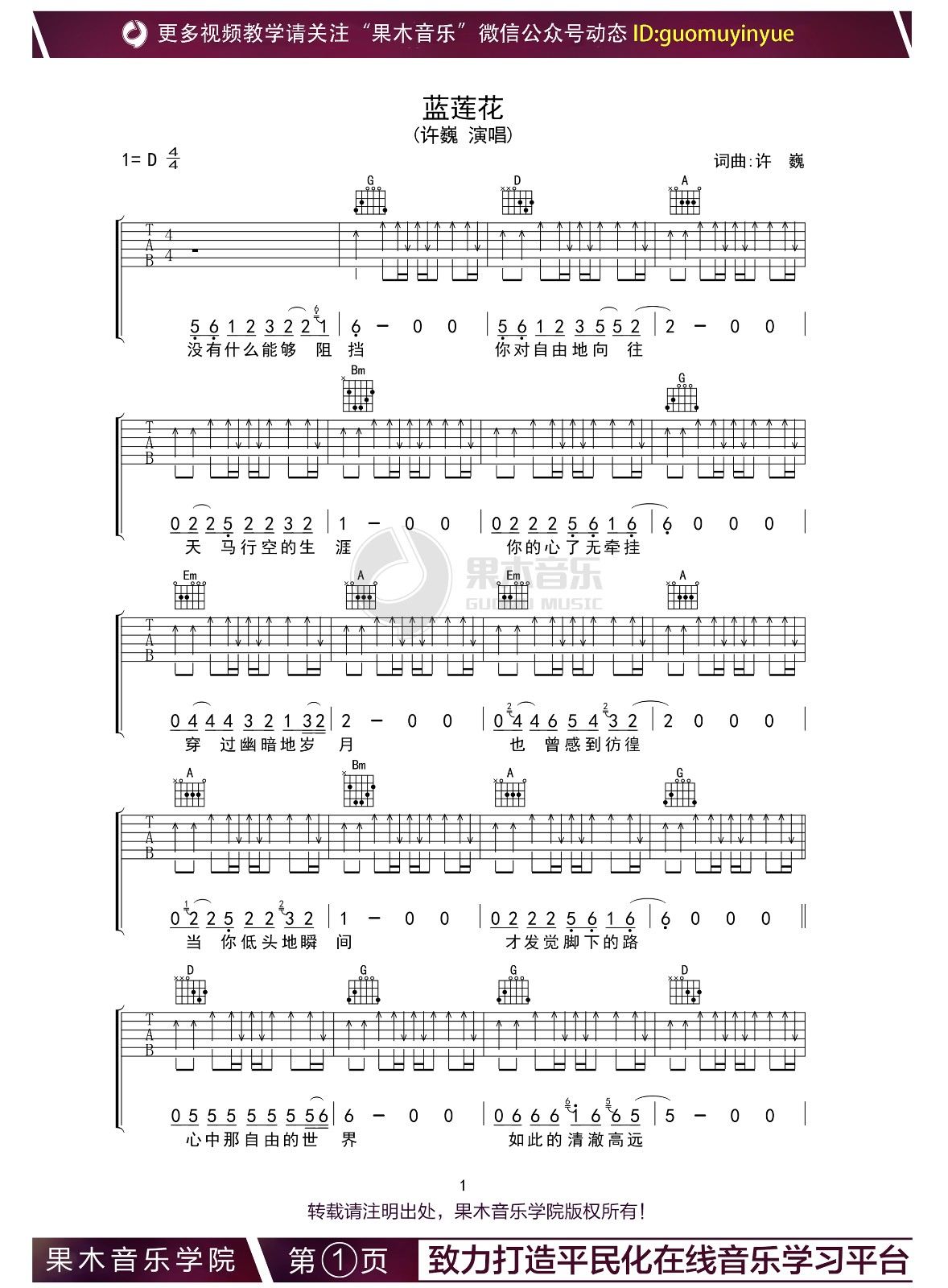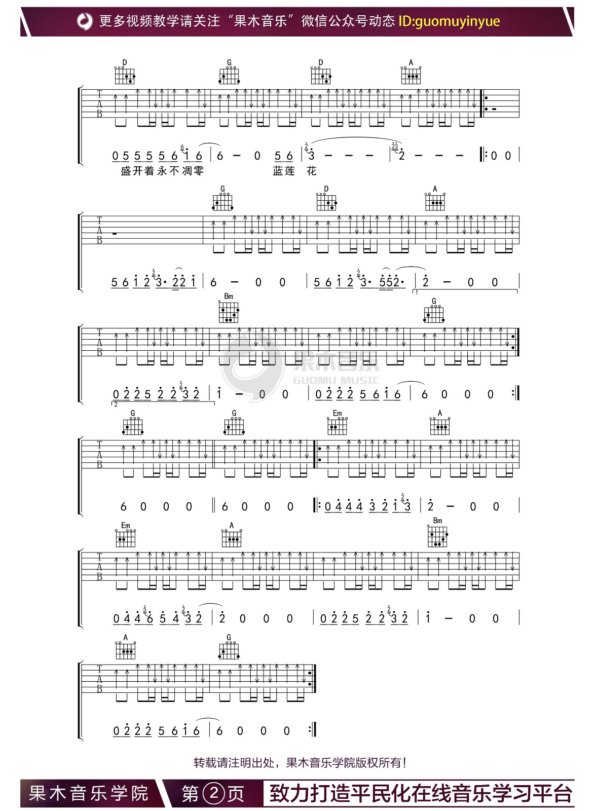 曲谱介绍: 蓝莲花吉他谱分享,D调高清版吉他弹唱谱,来自果木老师编配制谱,高清六线谱格式。歌曲一共用到了G、D、A、Bm、Em五个和弦,右手伴奏型是扫弦形式,从头至尾都是一种伴奏方式,难度一般,大家演奏这首歌的重点应放在扫弦层次感上。 歌曲名称:蓝莲花演唱歌手:许巍编配选调:1=D歌曲原调:1=D变调夹:按需选择所用和弦:G、D、A、Bm、Em曲谱类型:弹唱六线谱演奏速度:92拍每分钟演奏视频:暂无图谱数量:共 2 张制谱编配:果木音乐演奏难度: 吉他谱图片