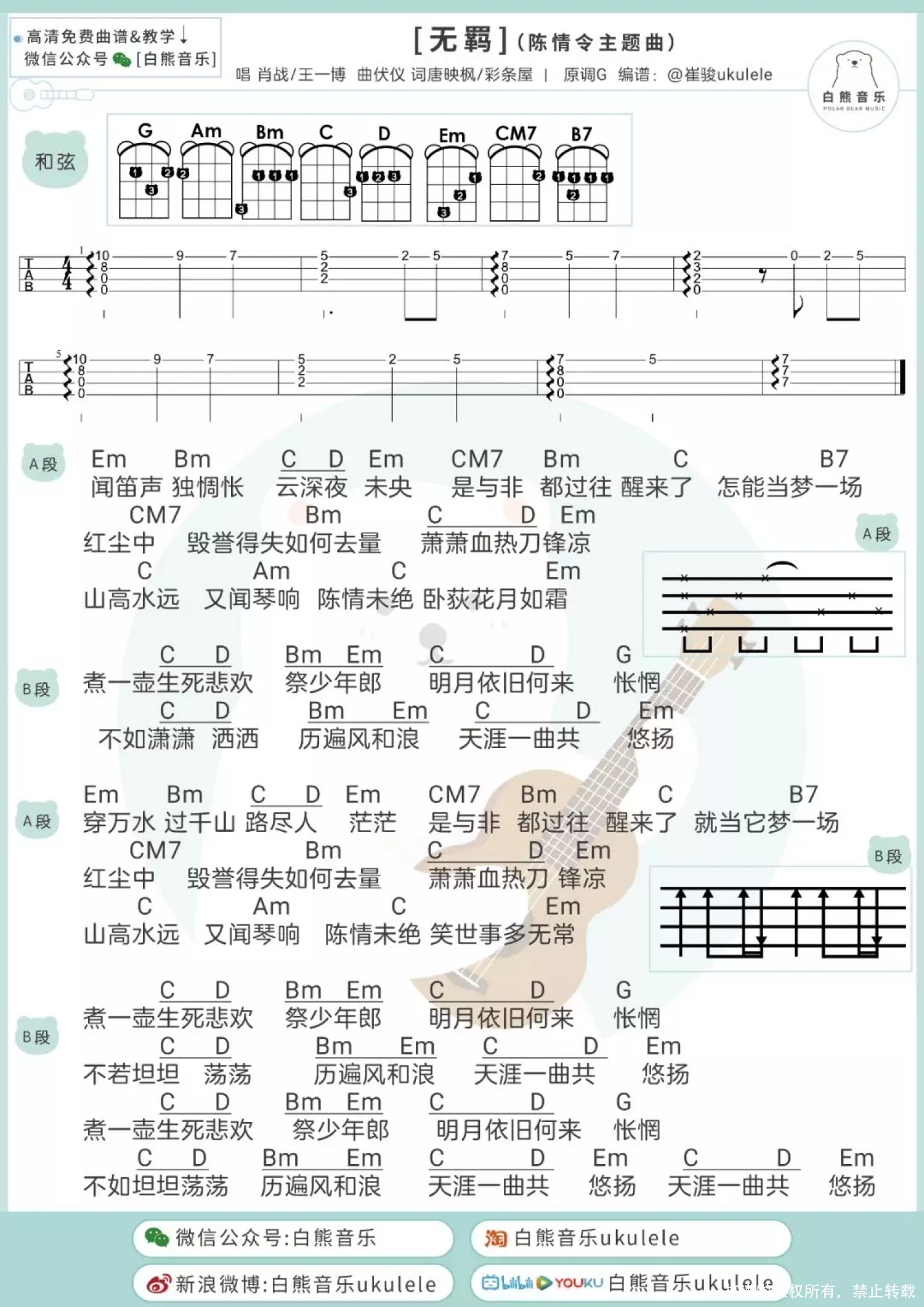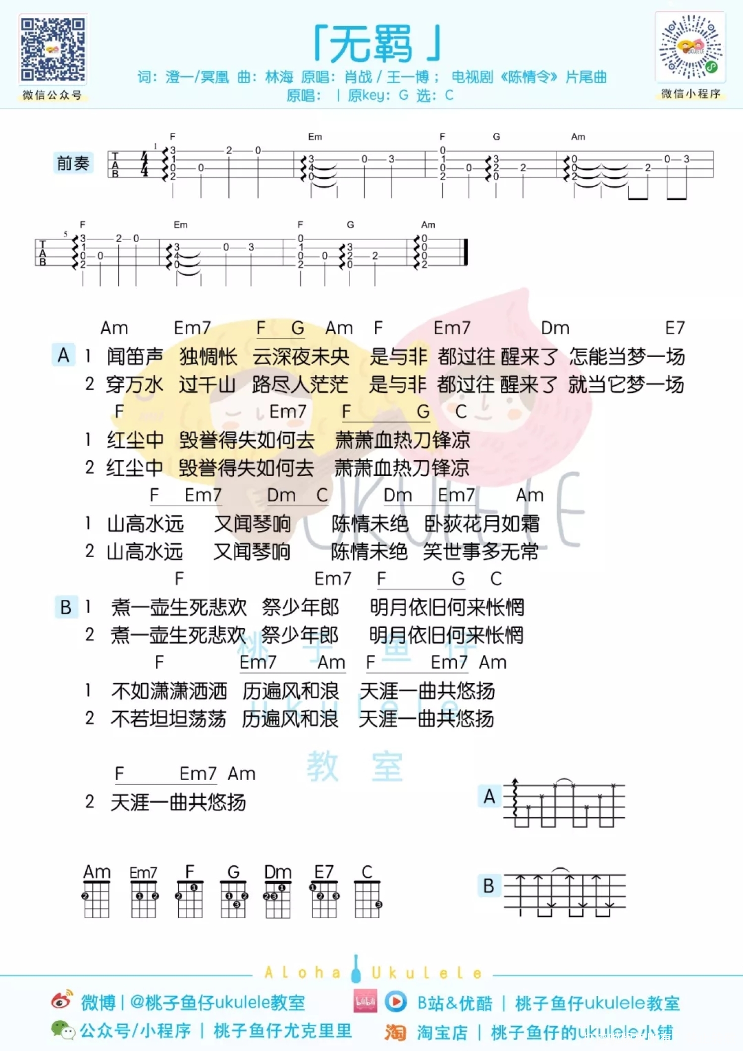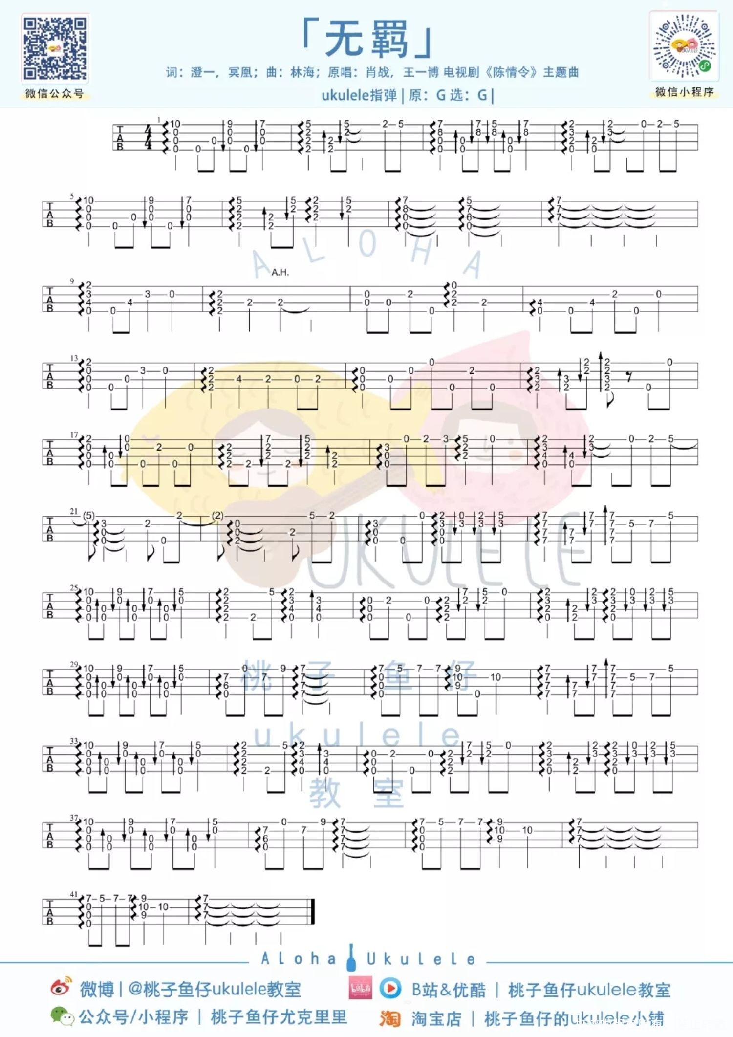 曲谱介绍: 白熊音乐版 趣弹版 桃子版 无羁ukulele指弹 目录 白熊音乐版 无羁Ukulele指弹cover   无羁尤克里里指弹教学|@崔骏ukulele   无羁弹唱教学|@崔骏ukulele   无羁ukulele谱 1、指弹谱 2、弹唱谱 3、吉他谱   趣弹版 loha! 大家有没有在追《陈情令》鸭 夷陵老祖他骑着小苹果来了! 不知道有多少人和趣酱一样 从当初的“我是不会去看的” 到现在的每周都守着看的“真香”呢 如今《陈情令》的火爆程度呢 大概是每到播出的晚上 陈情令相关的热搜就会疯狂上升 看过剧以后,有没有被那一支陈情,一曲《无羁》,一句古韵十足万语千言皆融于斯的“煮一壶生死悲欢祭少年郎”俘获!谁看了不上头呢(痴傻姨母笑)!   尤克里里弹唱演示丨无羁(忘羡)   尤克里里弹唱教学 丨无羁(忘羡)   尤克里里谱 丨无羁(忘羡)   桃子版 无羁ukulele指弹 ukulele 指弹演示《无羁》   ukulele指弹教学+谱 1、指弹谱   2、弹唱谱