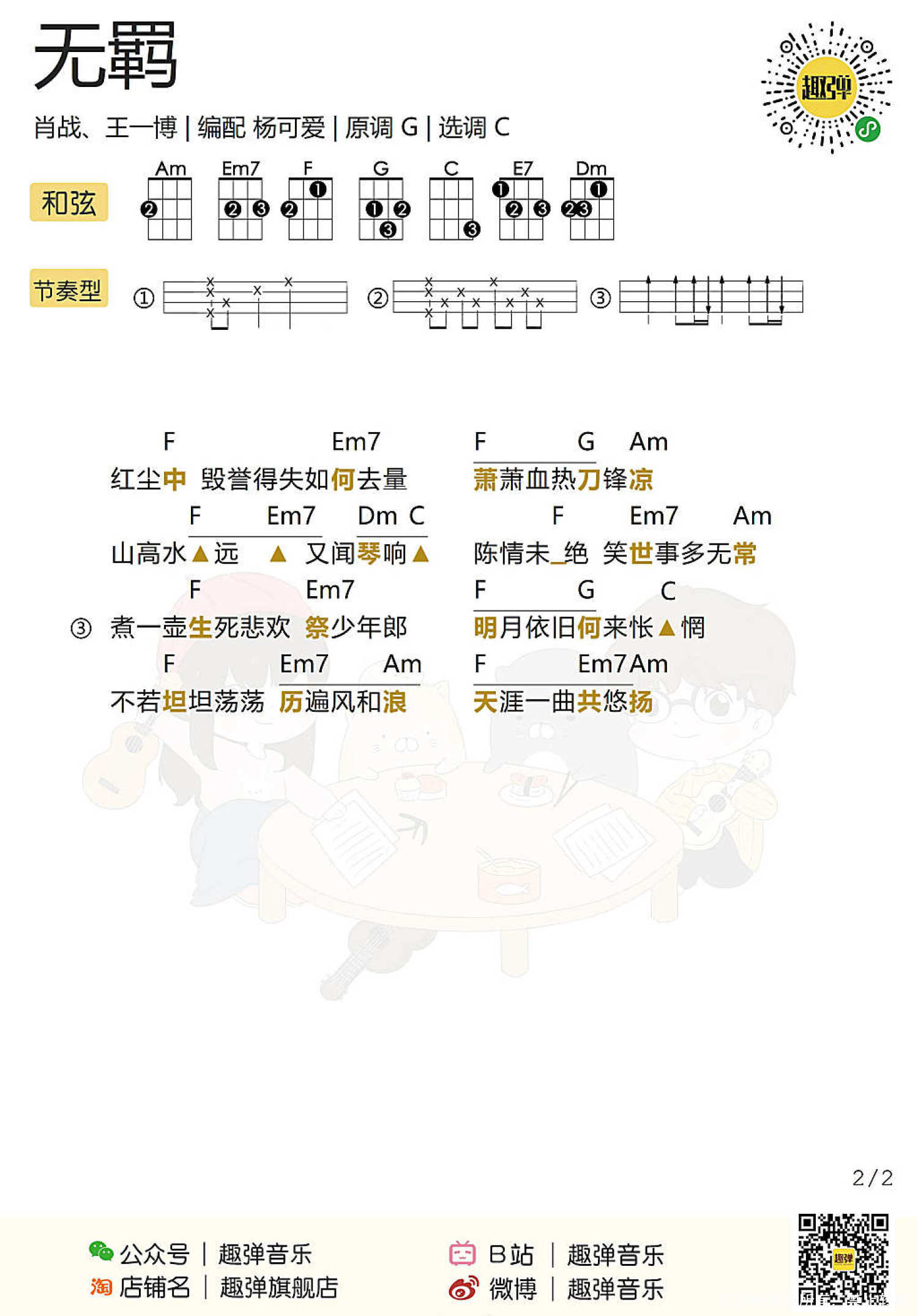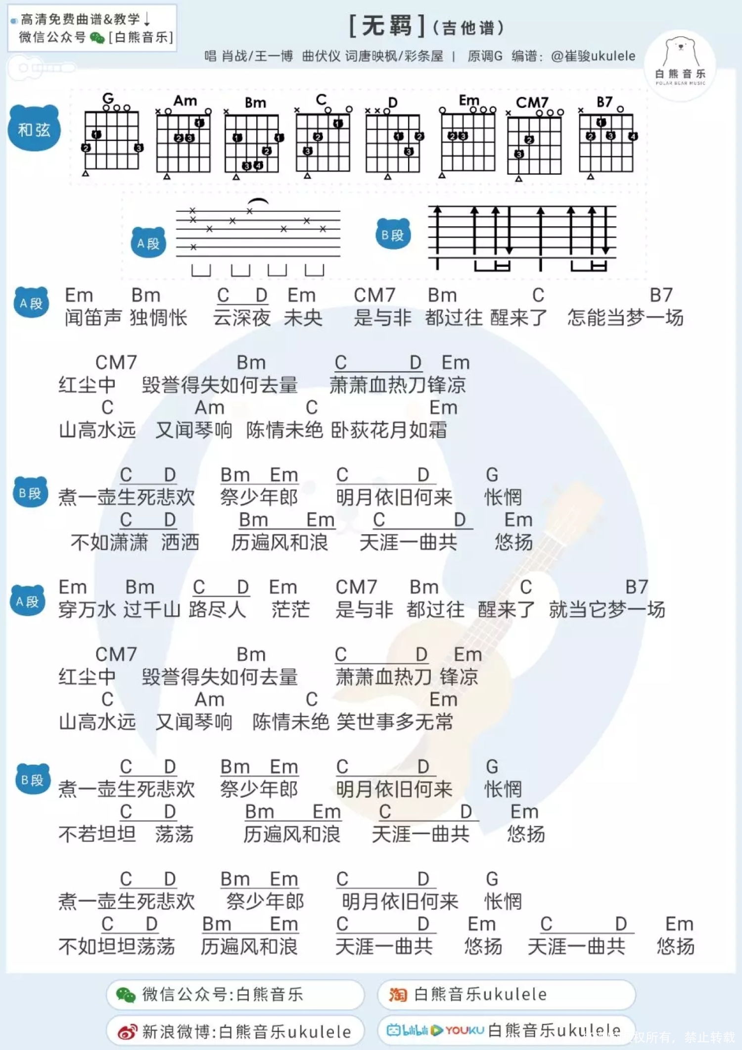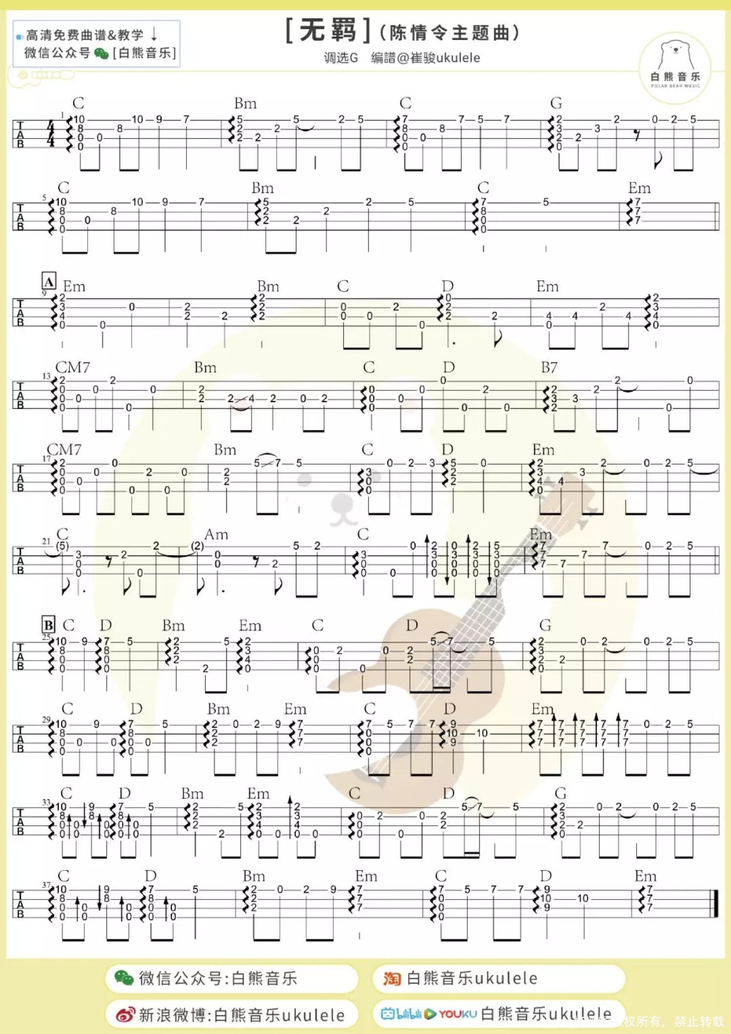 曲谱介绍: 白熊音乐版 趣弹版 桃子版 无羁ukulele指弹 目录 白熊音乐版 无羁Ukulele指弹cover   无羁尤克里里指弹教学|@崔骏ukulele   无羁弹唱教学|@崔骏ukulele   无羁ukulele谱 1、指弹谱 2、弹唱谱 3、吉他谱   趣弹版 loha! 大家有没有在追《陈情令》鸭 夷陵老祖他骑着小苹果来了! 不知道有多少人和趣酱一样 从当初的“我是不会去看的” 到现在的每周都守着看的“真香”呢 如今《陈情令》的火爆程度呢 大概是每到播出的晚上 陈情令相关的热搜就会疯狂上升 看过剧以后,有没有被那一支陈情,一曲《无羁》,一句古韵十足万语千言皆融于斯的“煮一壶生死悲欢祭少年郎”俘获!谁看了不上头呢(痴傻姨母笑)!   尤克里里弹唱演示丨无羁(忘羡)   尤克里里弹唱教学 丨无羁(忘羡)   尤克里里谱 丨无羁(忘羡)   桃子版 无羁ukulele指弹 ukulele 指弹演示《无羁》   ukulele指弹教学+谱 1、指弹谱   2、弹唱谱