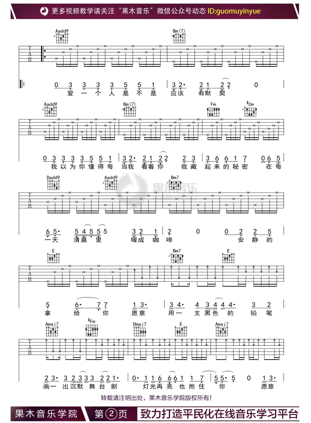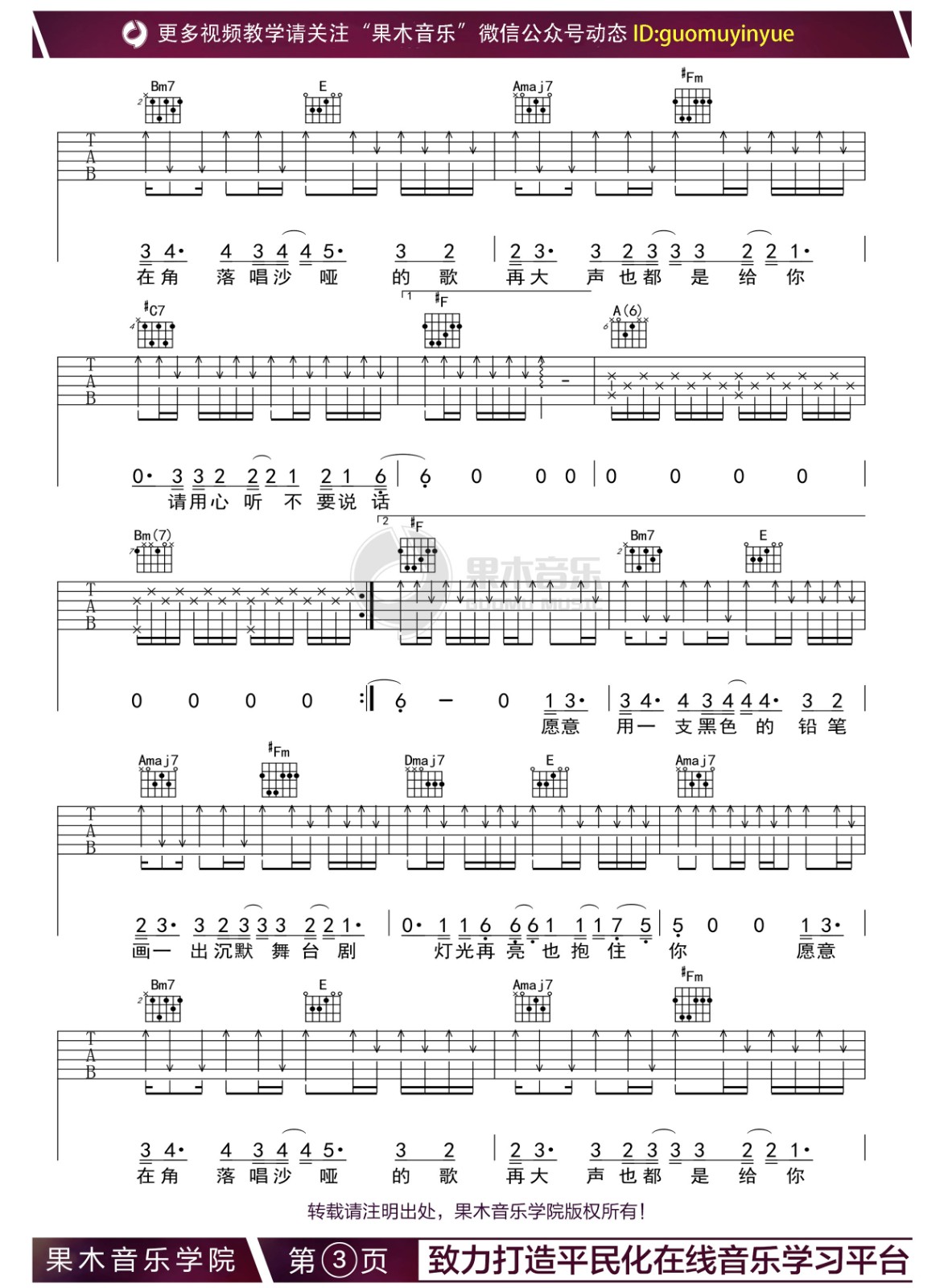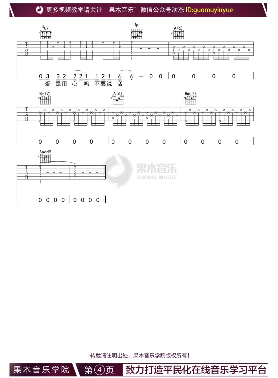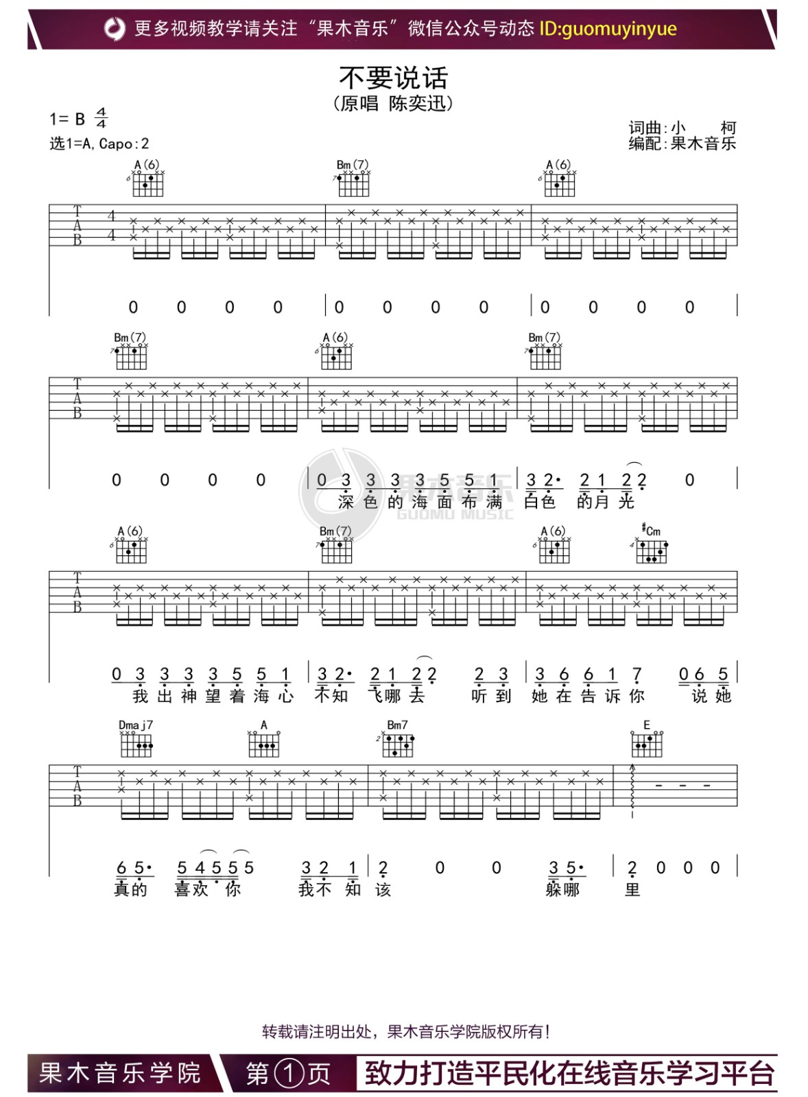曲谱介绍: 爱一个人是不是应该有默契,我以为你懂得,请用心听,不要说话。陈奕迅《不要说话》,生活似一杯苦咖啡须慢品,我爱你的心需要用心听。 歌曲名称:不要说话演唱歌手:陈奕迅编配选调:1=A歌曲原调:1=B变调夹:第二品所用和弦:A(6)、Bm(7)、#Cm、Dmaj7、A、Bm7、E、Aadd9、Fm Dadd9、Amaj7、#Fm、#C7曲谱类型:弹唱六线谱演奏速度:67拍每分钟图谱数量:共 4 张制谱编配:果木音乐演奏难度: 不要说话吉他谱,A调选调指法吉他弹唱谱,六线谱格式,来自果木老师编配制谱,共四张谱例,唱原调请变调夹夹第二品。