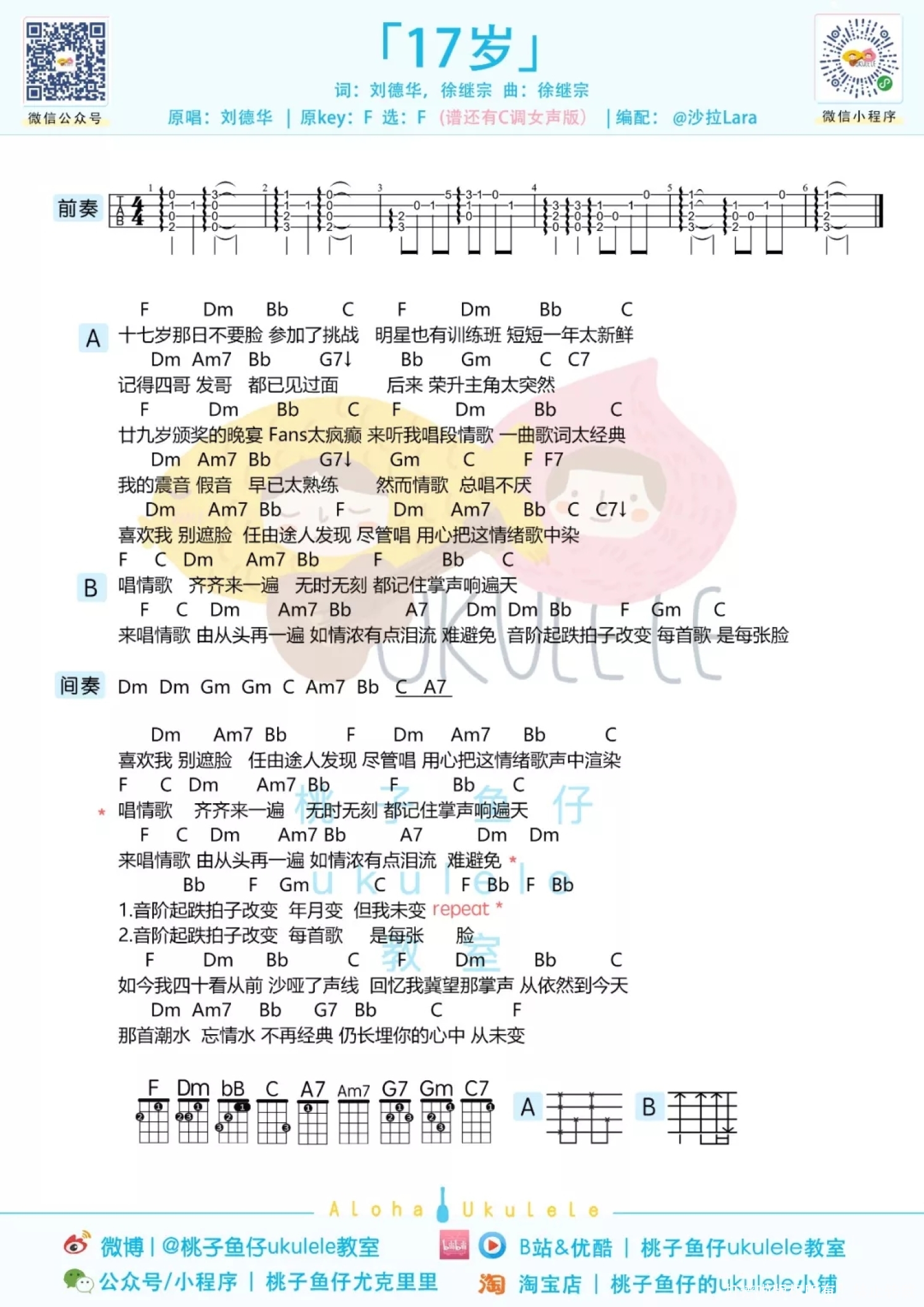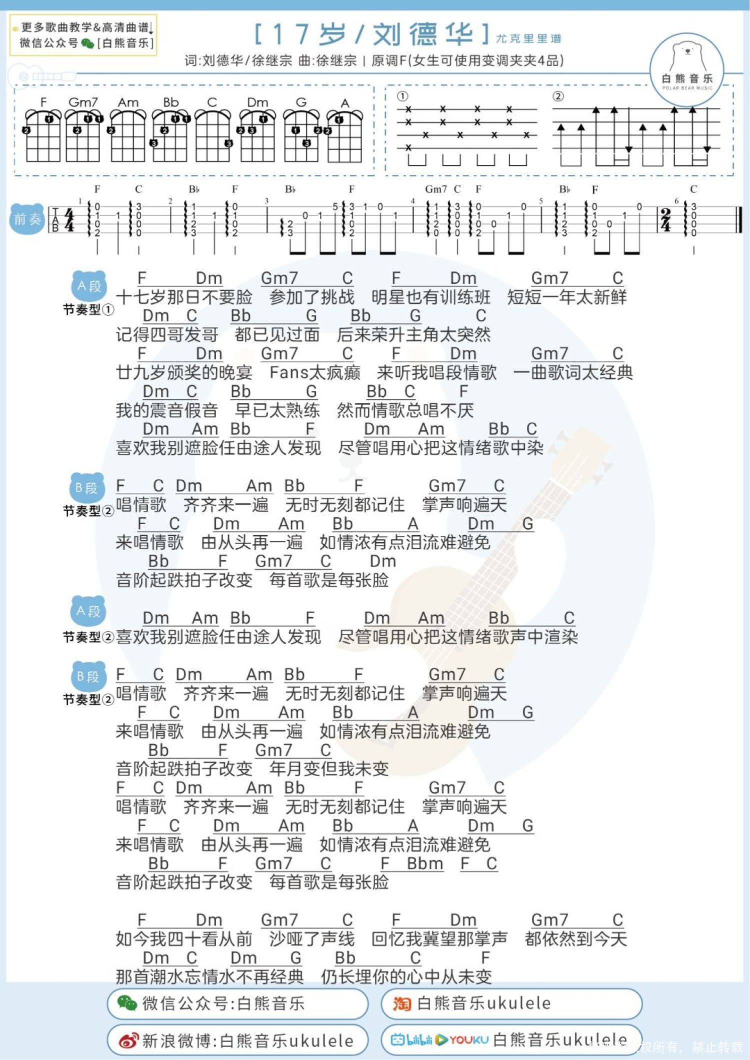 曲谱介绍: “十七岁那日不要脸 参加了挑战 明星也有训练班 短短一年太新鲜 记得四哥 发哥 都已见过面 “ 这首歌,它没有《忘情水》经典,没有《来生缘》伤感,也没有像《世界第一等》那样,现在还在流传。但刘德华把自己一生的轨迹,都藏在了这首歌中。   17岁尤克里里弹唱教学   17岁尤克里里谱 1、女声版   2、男声版   3、白熊版 17岁 ukulele谱   4、白熊版 17岁 吉他谱
