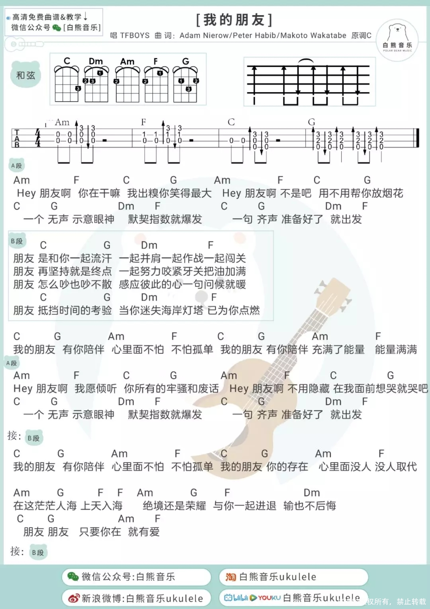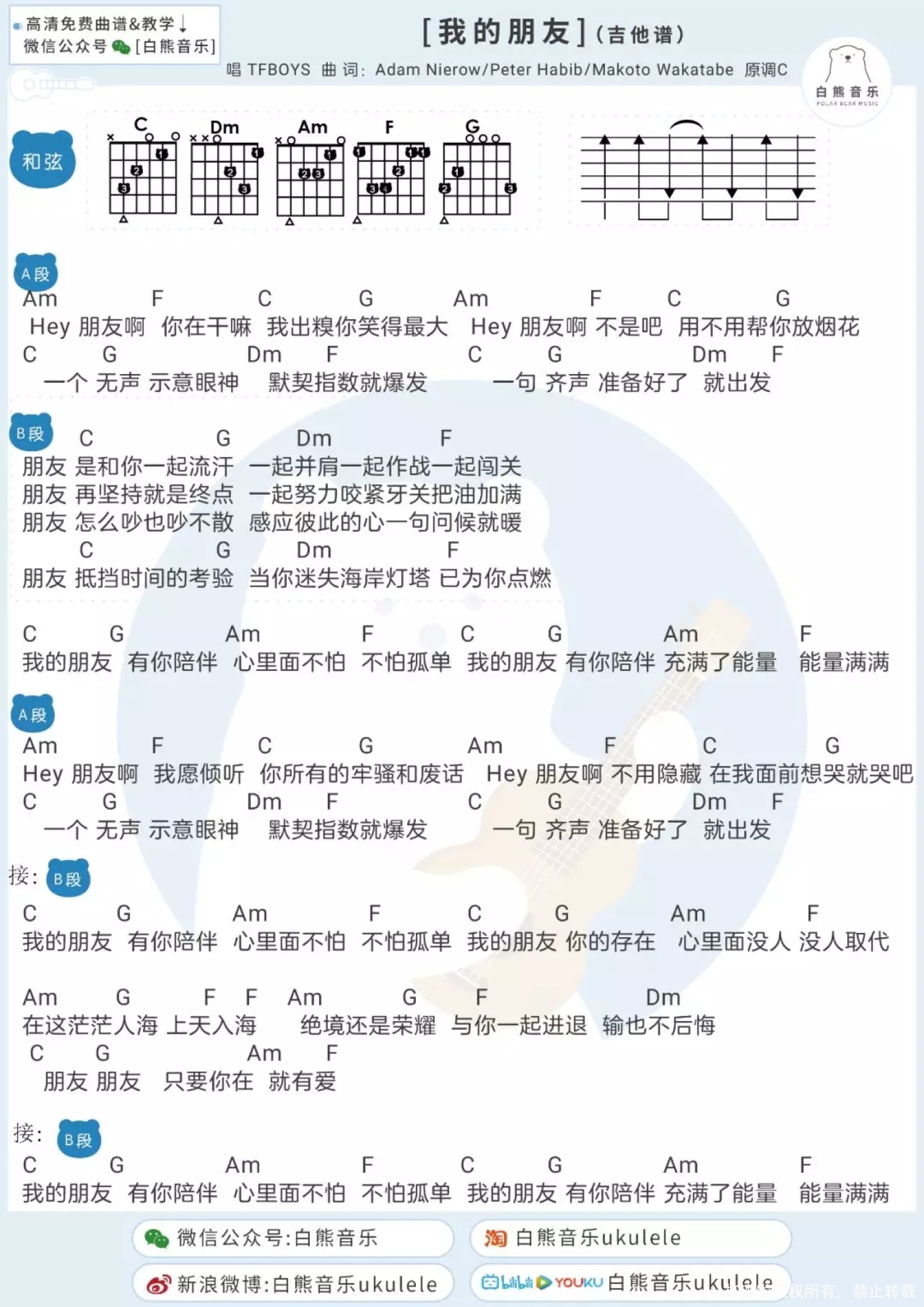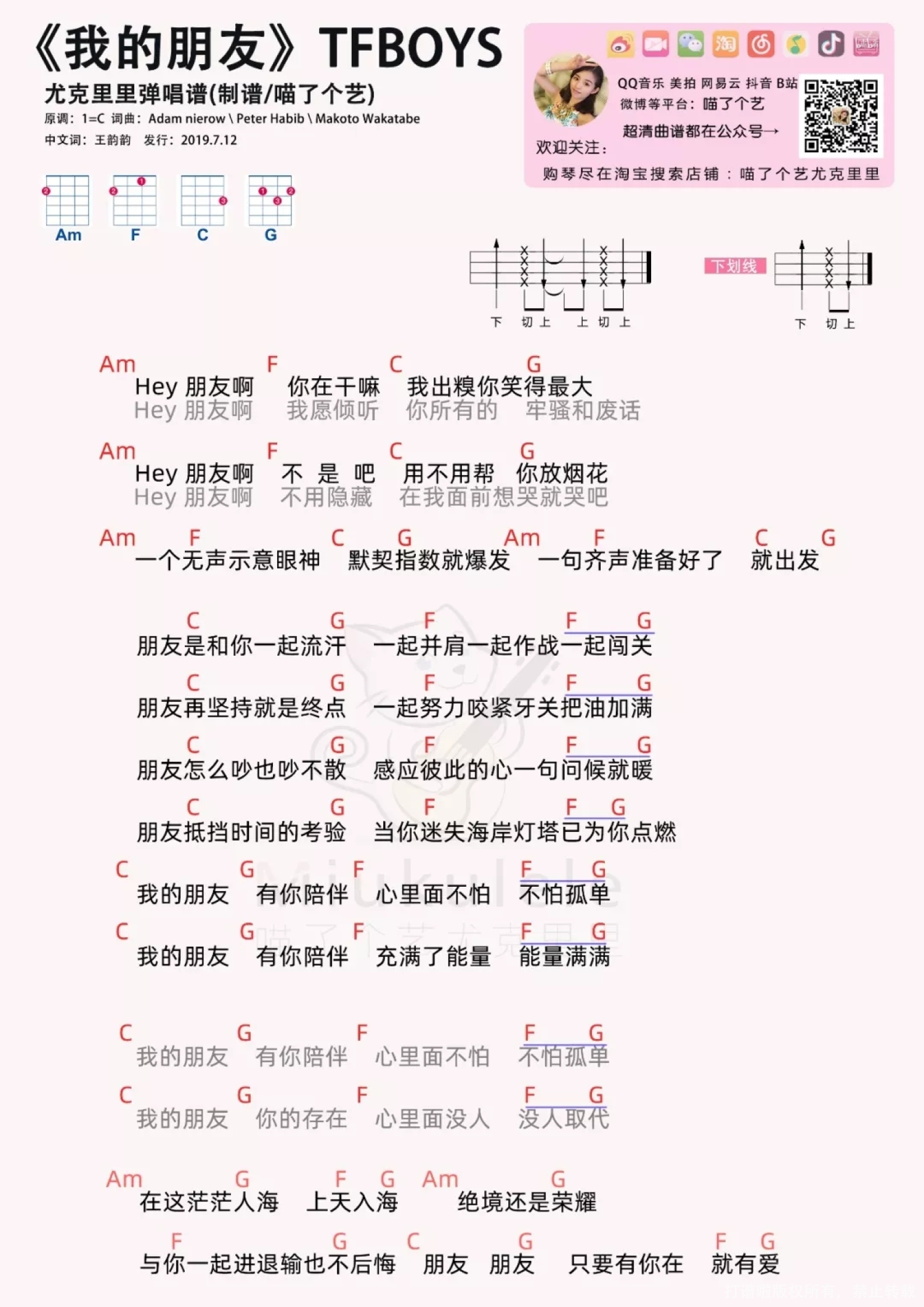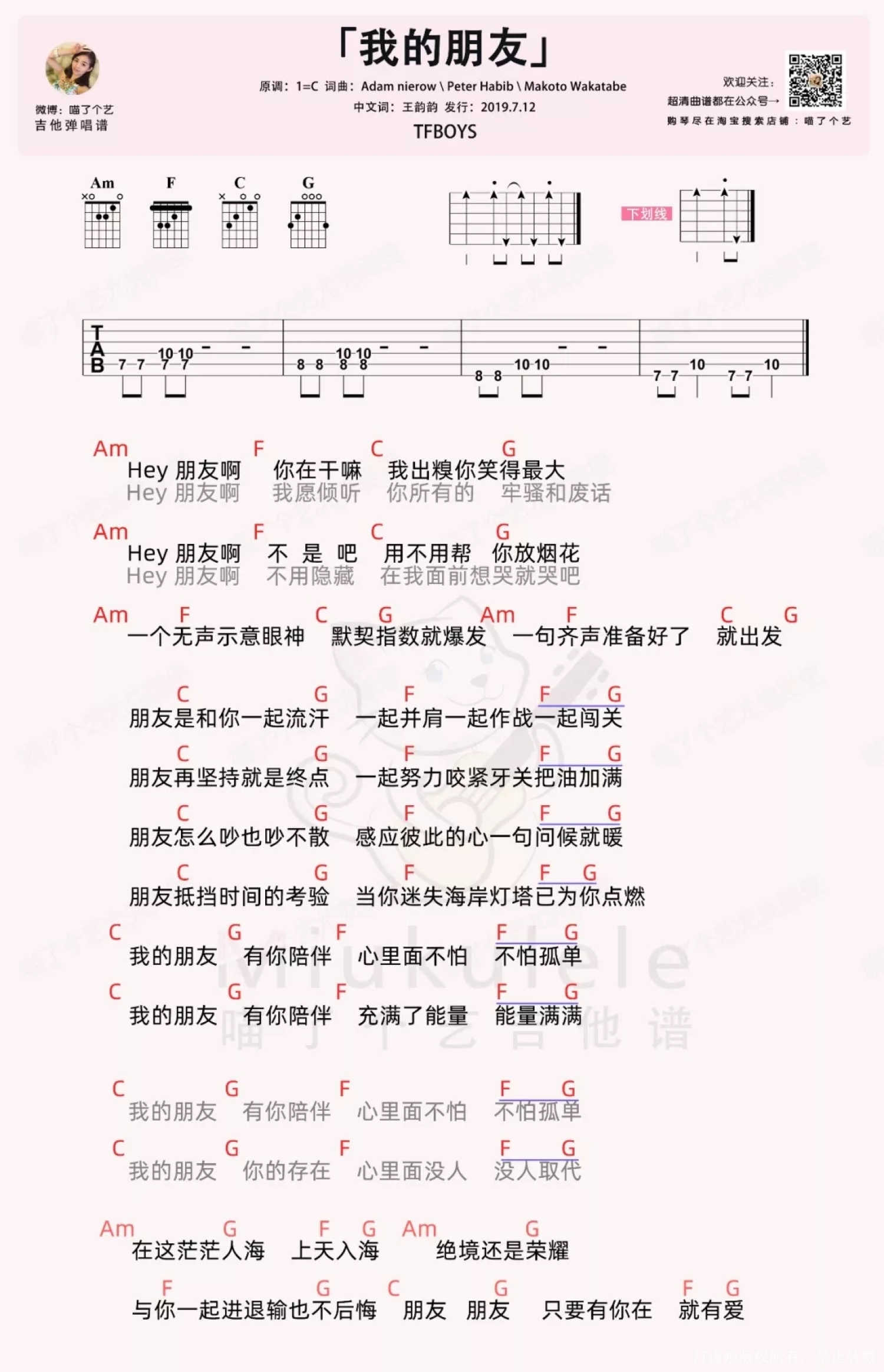 曲谱介绍: 今日份吉他弹唱|@TFBOYS组合 《我的朋友》 喜欢每一首快乐的团歌!赞美每一首友谊的团歌! 朋友间的默契真的很奇妙,比如中午这首歌出来后,我就跟制作和林老师说晚上来翻这首吧,可是我们分别都有事,忙到晚上9点多才集合,然后就出了这个简陋的翻唱,但这个过程真的很快乐[给你小心心] 祝大家都能找到一起并肩作战的朋友!   我的朋友吉他cover   我的朋友尤克里里谱   我的朋友吉他谱 白熊版 我的朋友ukulele谱   白熊版 我的朋友吉他谱