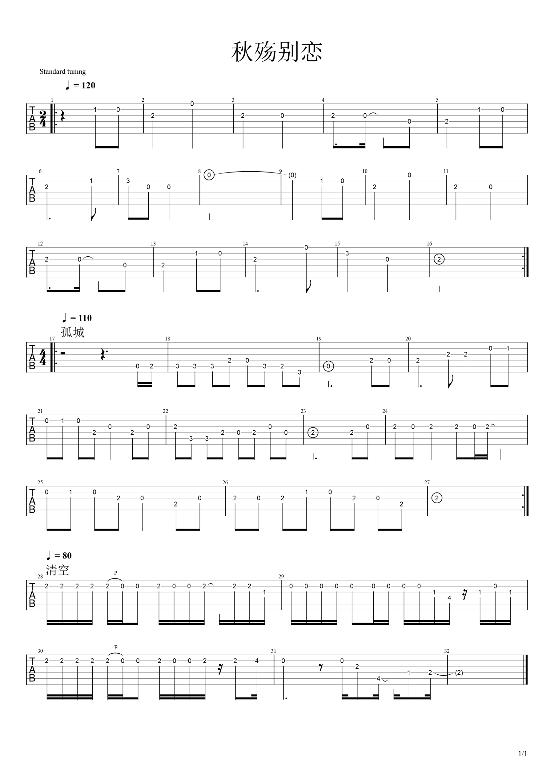秋殇别恋/孤城/清空吉他谱 - C调吉他独奏谱