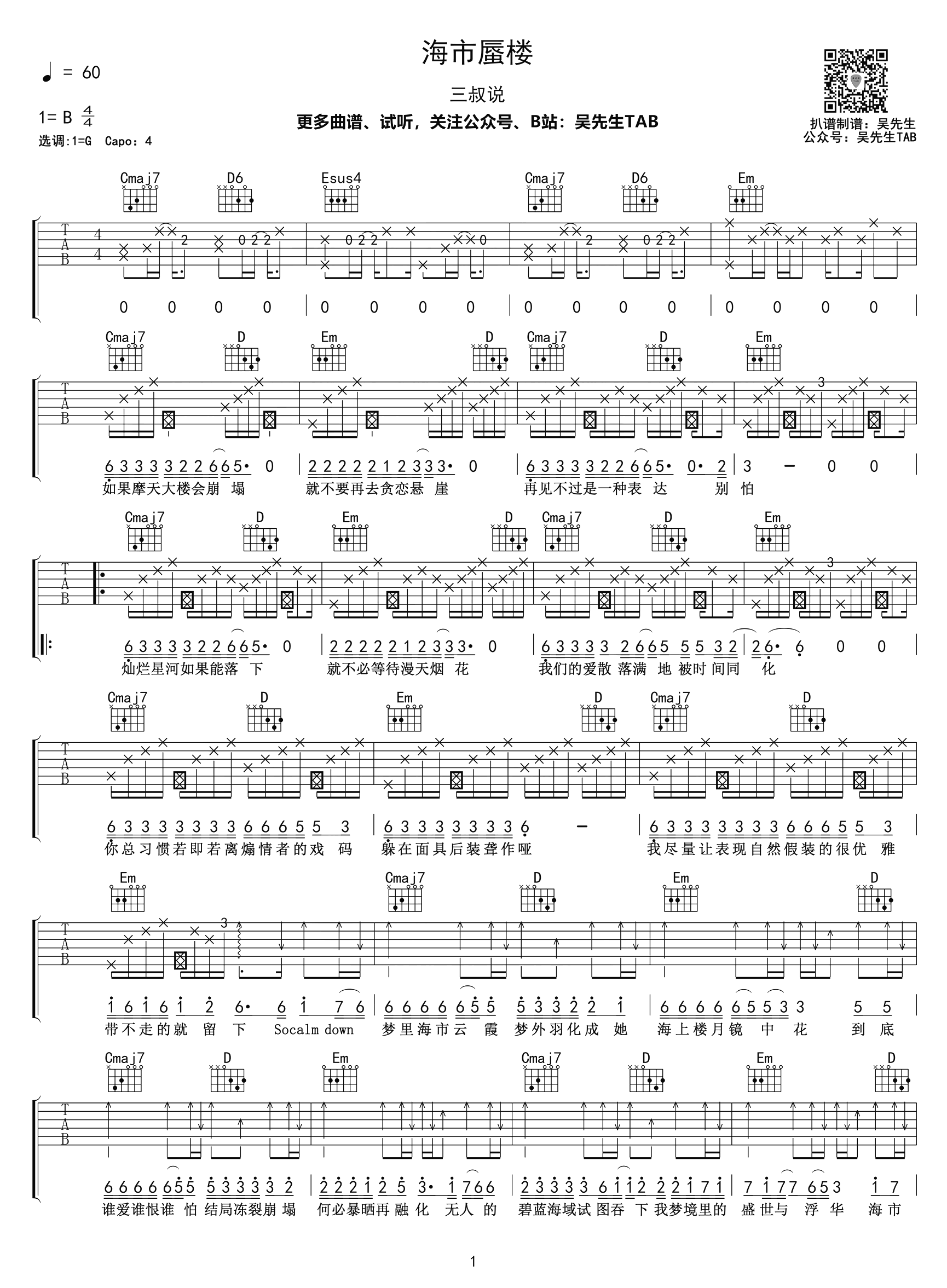 曲谱介绍: 海市蜃楼吉他谱,三叔说演唱,原调B选调G,这首歌的和弦走向跟姚六一的《雾里》完全一样的,只不过是调式不同。一颗狼星的版本是降E调,变调夹夹3平用C调指法就是:Fmaj7--G--Am--Am-G;Fmaj7--G--Am--Am-- 梦里梦外散落一地的记忆碎片,究竟哪些是现实哪些是幻境呢?你是灿落在我人生轨迹的某个落点,却成了南柯一梦。