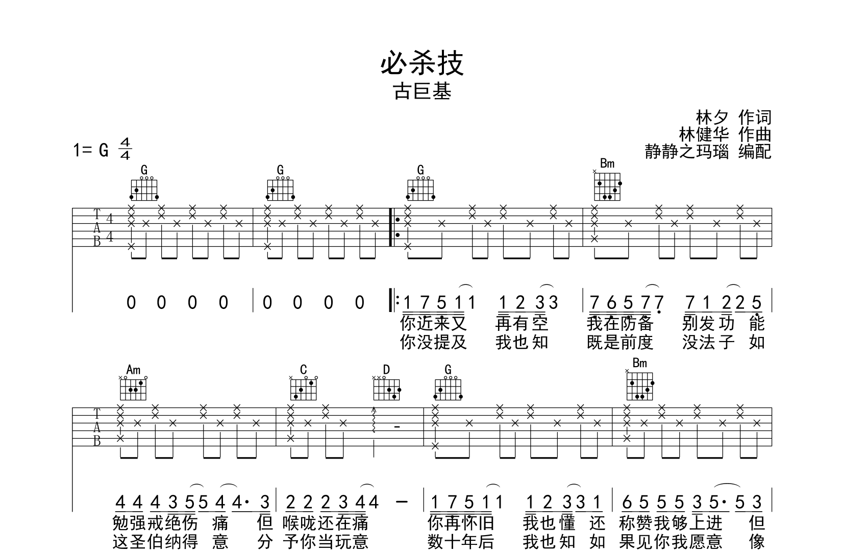 曲谱介绍: 必杀技吉他谱_古巨基_《必杀技》G调简易原版弹唱谱分享,《必杀技》是古巨基一首非常经典的歌曲,这首歌用着游戏术语来诠释着感情中的来回博弈,我们许多人都在爱情里面没有去感受本身的滋味,反而在互相受伤,如果本是如此,何必开始就在一起呢? 由创作者@静静之玛瑙制谱的《必杀技》吉他谱,古巨基演唱,《必杀技》吉他六线谱,共两张高清图片谱,节奏为4/4拍,速度为70拍每分钟,弹唱建议不夹变调夹,难度初级。