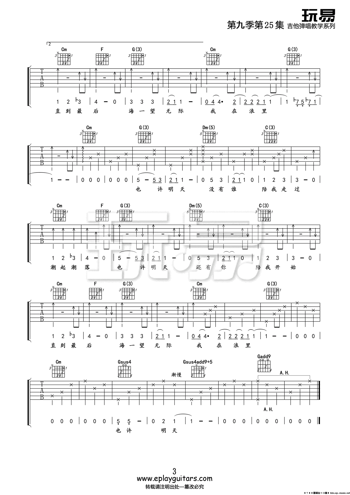 曲谱介绍: 吉他经常给我很多的满足。要想得到吉他给你带来的好处,你就必须付出努力。 《也许明天》吉他谱_张惠妹_原版六线谱_吉他弹唱教学分享,《也许明天》是由张惠妹演唱的歌曲,低沉的钢琴,磅礴的弦乐,大气不失深沉,而副歌中那充满爆发力的声音,一次次呐喊着明天与未来,呐喊着人生与情感,让人振奋。结束时的那一段出彩的演绎为歌曲做了一个完美的完结。阿妹也展示了她对音乐独特的领悟能力,已经对歌曲情感的独到掌握。