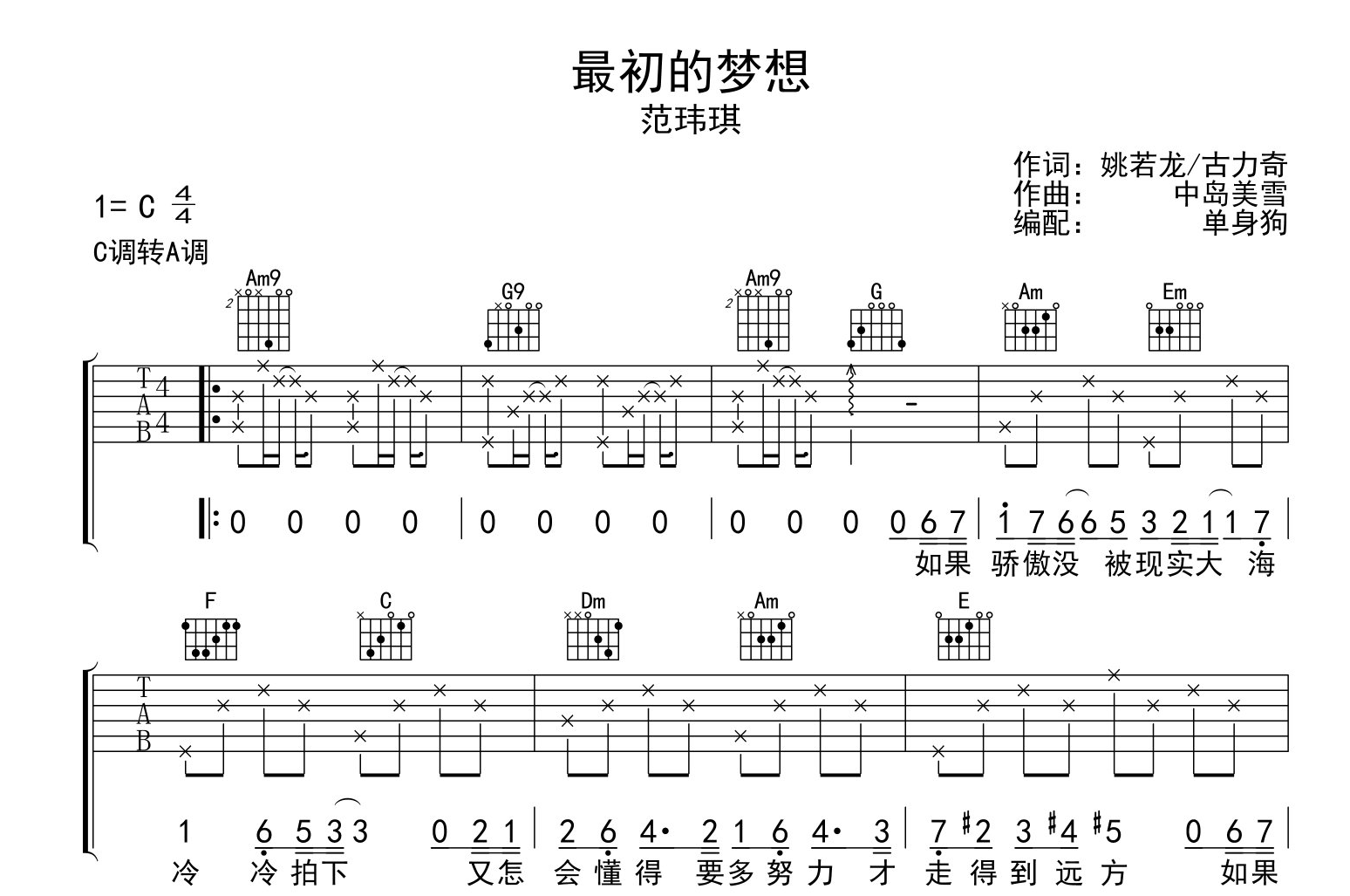 曲谱介绍: 范玮琪《最初的梦想》吉他谱_G转A调吉他弹唱谱分享,《最初的梦想》是范玮琪演唱的一首经典励志歌曲,梦想总能照进现实,我们每个人都在为自己最初的梦想而努力,也许很多路走着走着就变了,但始终在心中的那颗初心却没有变。 范玮琪《最初的梦想》吉他谱,创作者@单身狗制谱,共有三张高清图片谱,选用C调转A调,以分解和弦+扫弦节奏为主,弹弹唱难度初级简单。