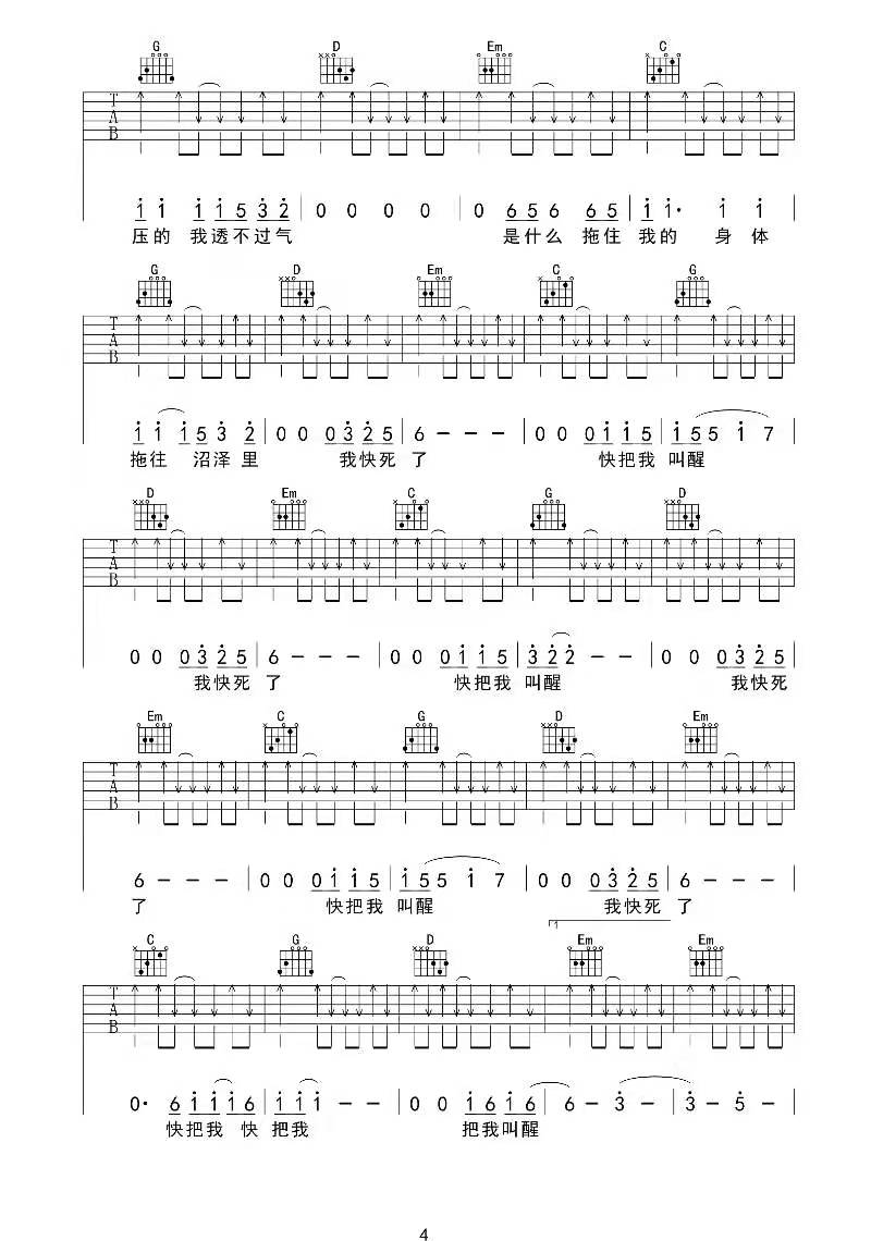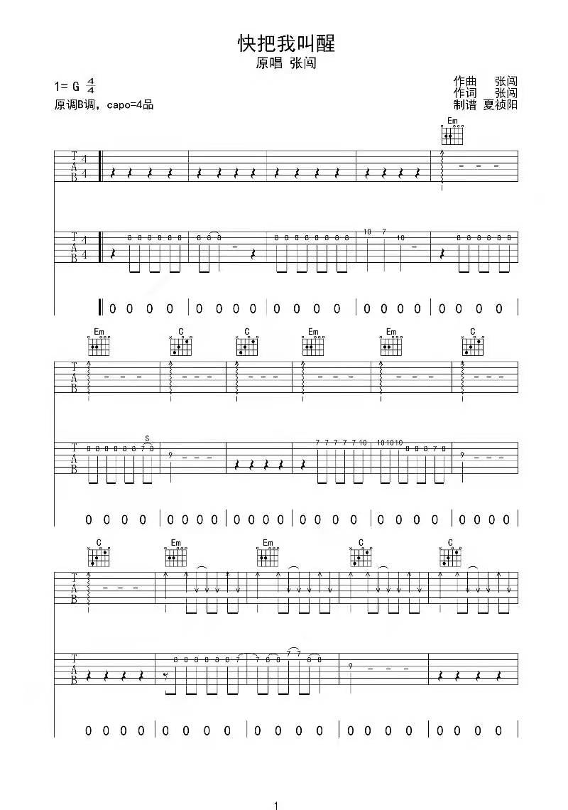 曲谱介绍: 张闯《快把我叫醒》吉他弹唱谱,采用G调指法编配,共有6张高清图谱。