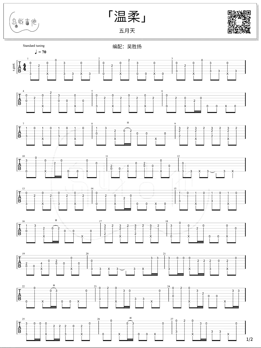 曲谱介绍: 五月天《温柔》吉他谱_独奏六线谱_《温柔》指弹演示+教学分享,天地间的“温柔”,像拥有了你的全世界,所有的美好都显得那么的柔和,最美妙的爱情就是那么的舒适,感受很好的爱情不需要解释,也不需要争执,希望我爱的那个你永远都那么的“温柔”,让我感受有你的世界都充满了“温柔”。 五月天《温柔》吉他谱(指弹谱),共有两张独奏图片谱,由岛屿吉他吴胜扬编配制谱,速度控制在70BPM,节奏4/4拍,弹奏可参考随谱的《温柔》指弹演示+教学视频。 《温柔》指弹吉他演示视频