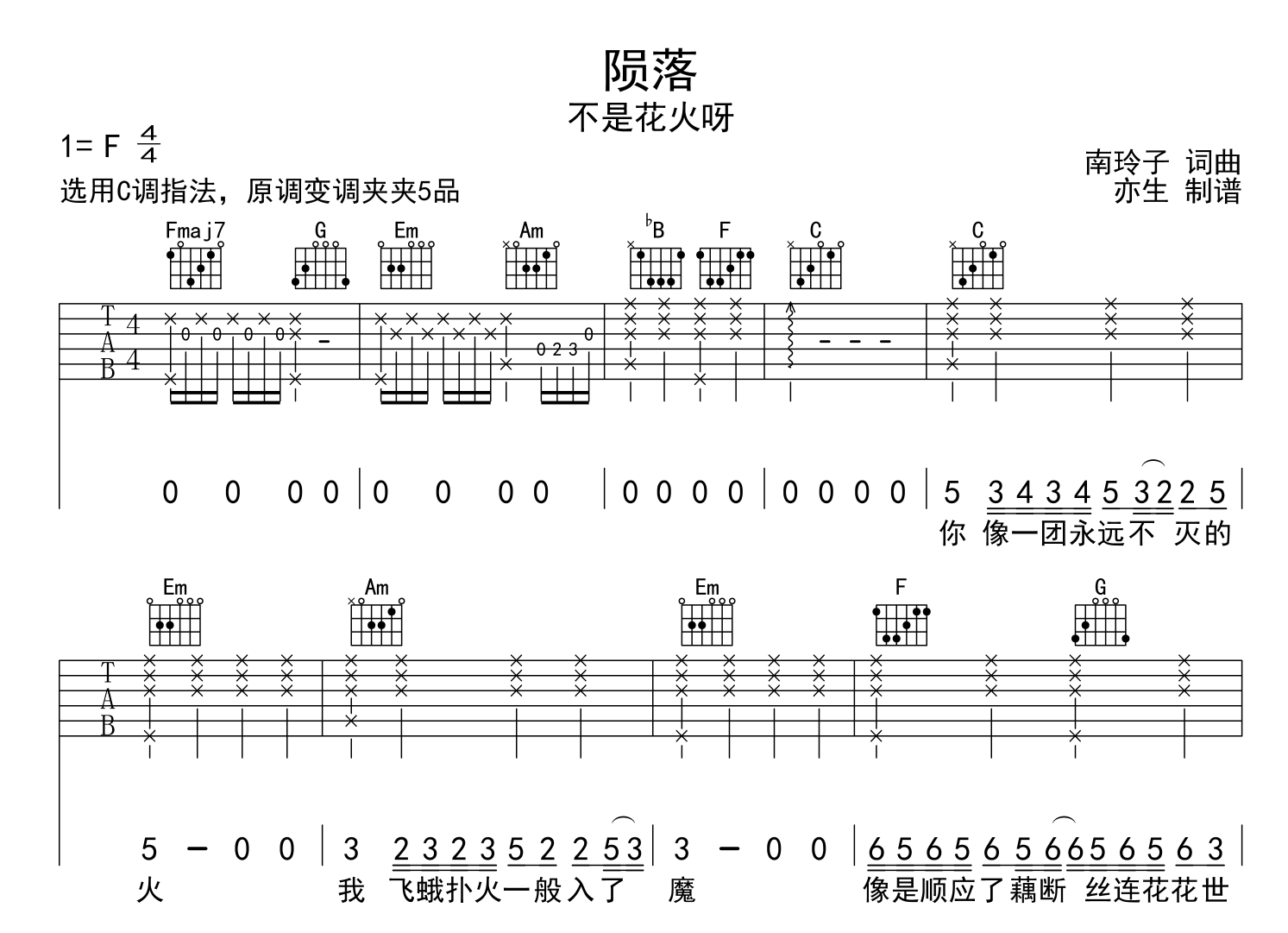 陨落吉他谱 - 不是花火啊 - C调吉他弹唱谱 - 原版