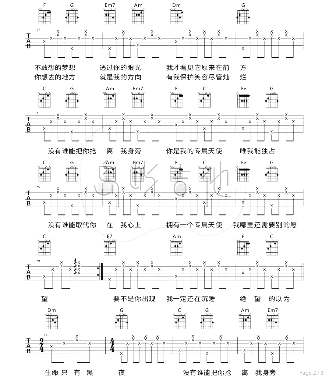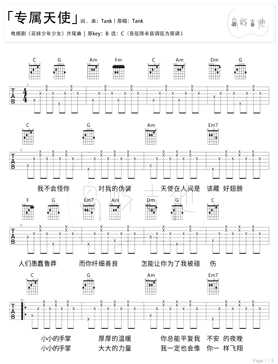 曲谱介绍: TANK《专属天使》吉他谱_C调吉他弹唱谱分享,《专属天使》是TANK创作并演唱的一首歌曲,曾是剧《花样少年少女》片尾曲,每个人心中都会有一位特殊的角色,TA就像你的专属天使一般,那么的宠爱,无论任何情况任何时候,一切都无法代替,因为自己的一切都早已属于TA。 TANK《专属天使》吉他谱,岛屿吉他制谱,共有三张高清图片谱,选用C调,需要降半音调弦,半分解和弦节奏,这个版本非常适合新手弹唱练习,难度初级。