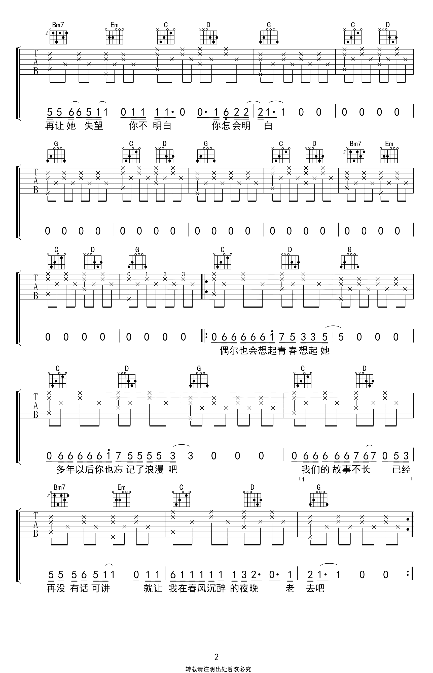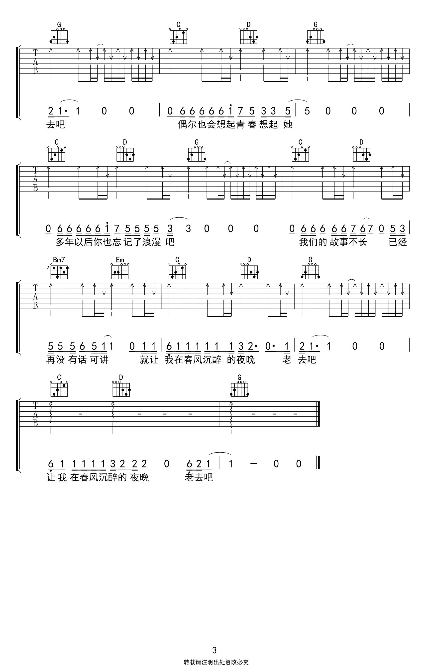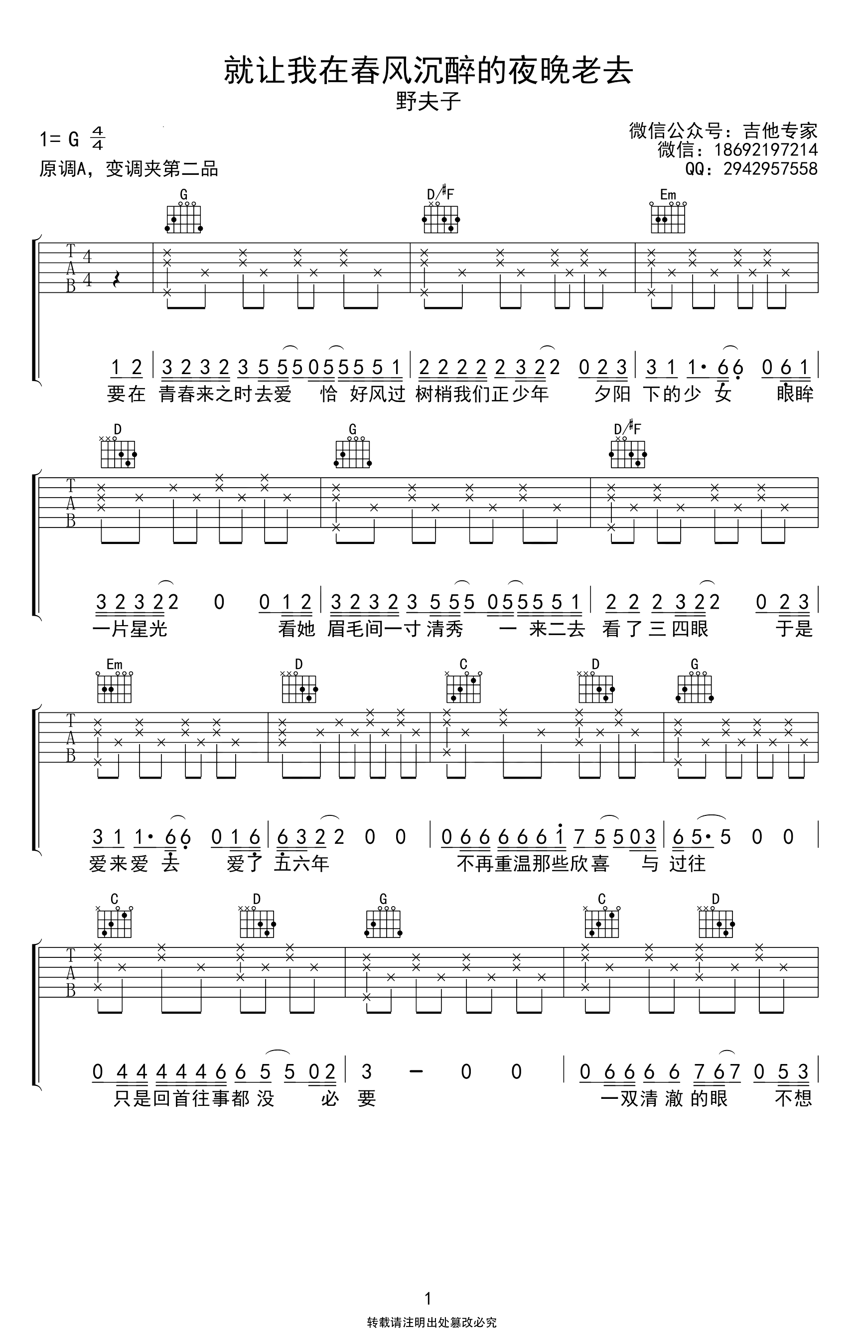 曲谱介绍: 就让我在春风沉醉的夜晚老去吉他谱,宝藏的小众歌手野夫子的一首民谣歌曲,一把吉他,简单的弹奏,单曲循环弹唱。多年以后你也忘记了浪漫吧,我们的故事不长,已经再没有话可讲,就让我在春风沉醉的夜晚老去吧。 ​ 《就让我在春风沉醉的夜晚老去》吉他谱,原调A选调G,变调夹夹第二品,三张图片高清六线谱。​​​祝大家都能开心,虽然这世界什么都像一阵风。