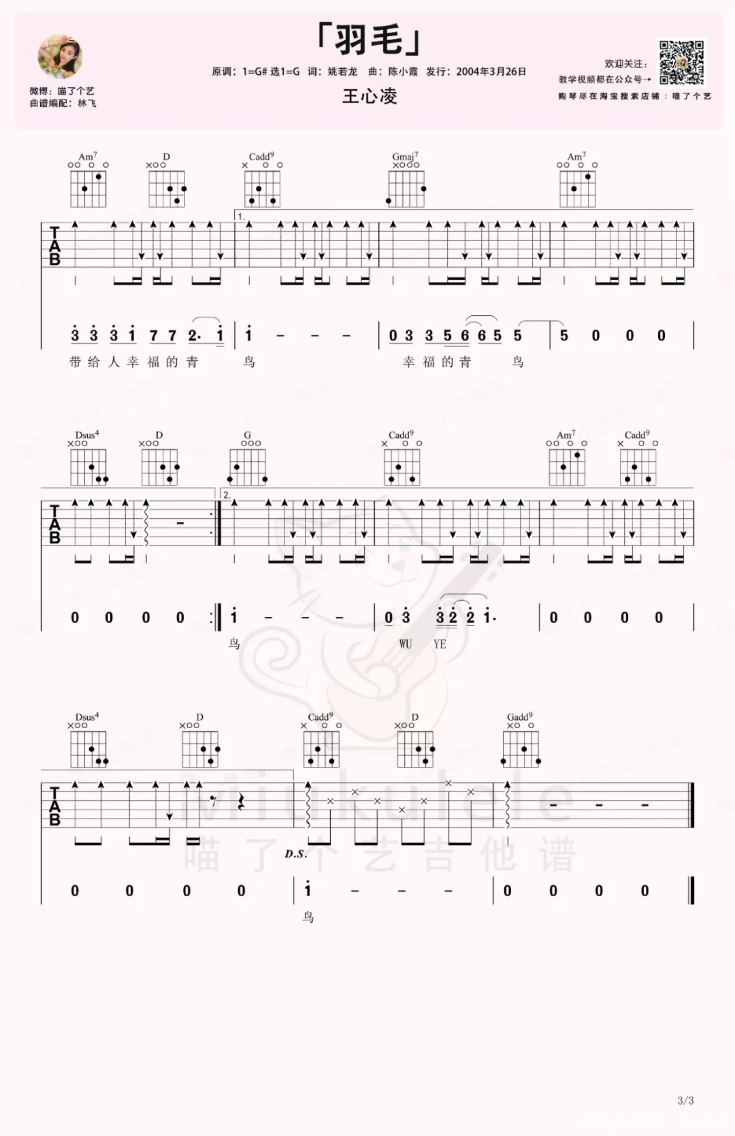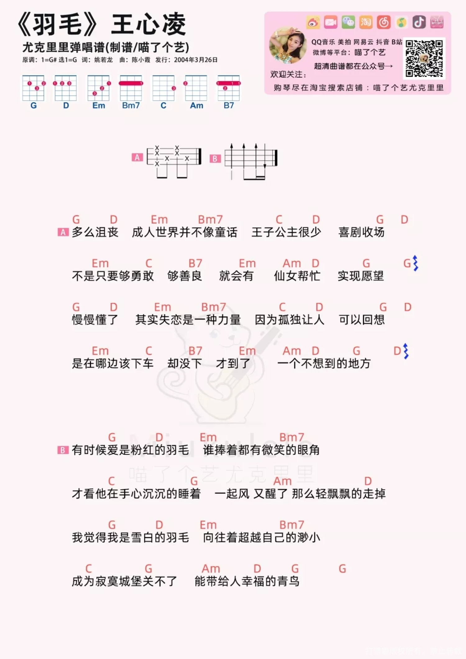 曲谱介绍: 呐,今天又是老歌!《羽毛》是Cindy《爱你》专辑中的歌,基本上歌词就是专为王心凌这样的甜心教主打造的,和弦都挺简单的,适合初学吉他弹唱的妹纸们。   羽毛弹唱cover   羽毛吉他弹唱教学   羽毛吉他谱   羽毛ukulele谱