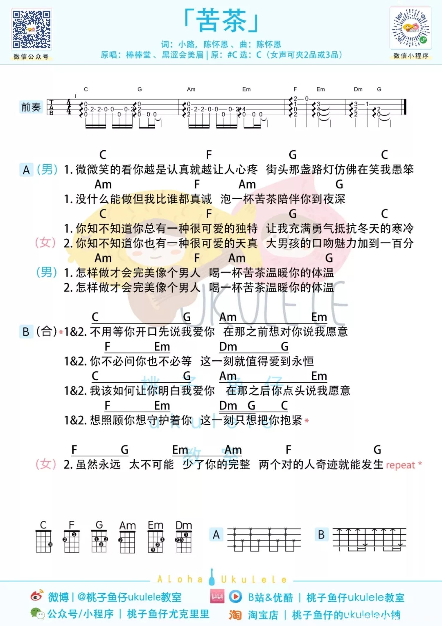 曲谱介绍: “不用等你开口先说我爱你 ” 怀念看《黑糖玛奇朵》的童年 还有青涩的棒棒糖和鬼鬼吴映洁   苦茶尤克里里弹唱谱