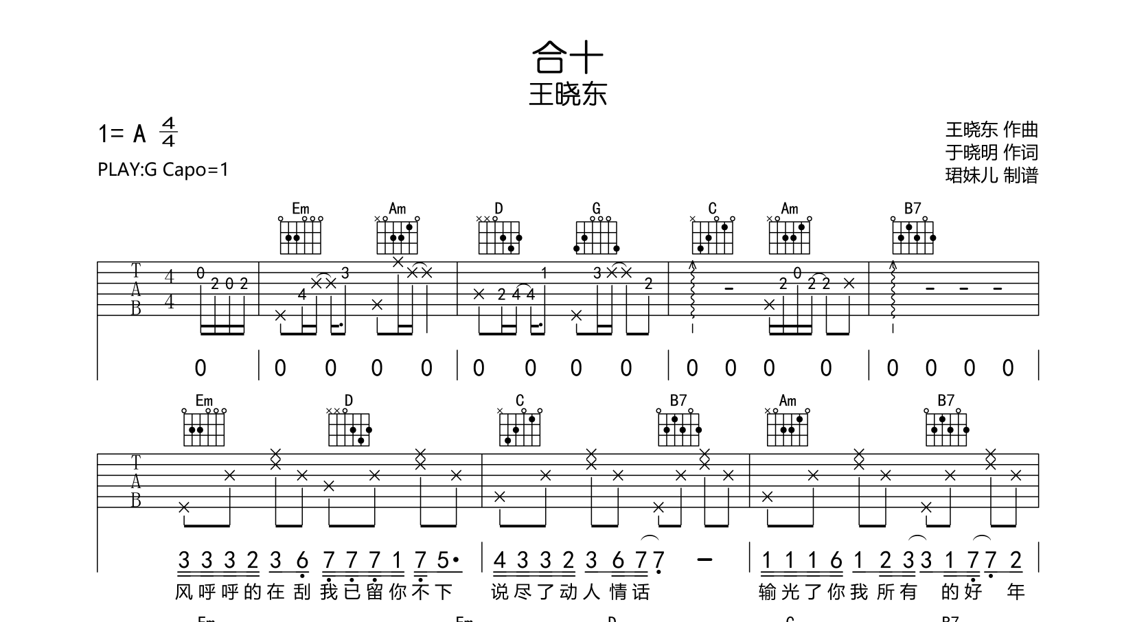 曲谱介绍: 王晓东《合十》吉他谱,由珺妹儿制谱,共两张图片谱,本谱采用G调指法编配,弹唱建议变调夹1品,速度85BPM,4/4拍,难度较简单,易上手。
