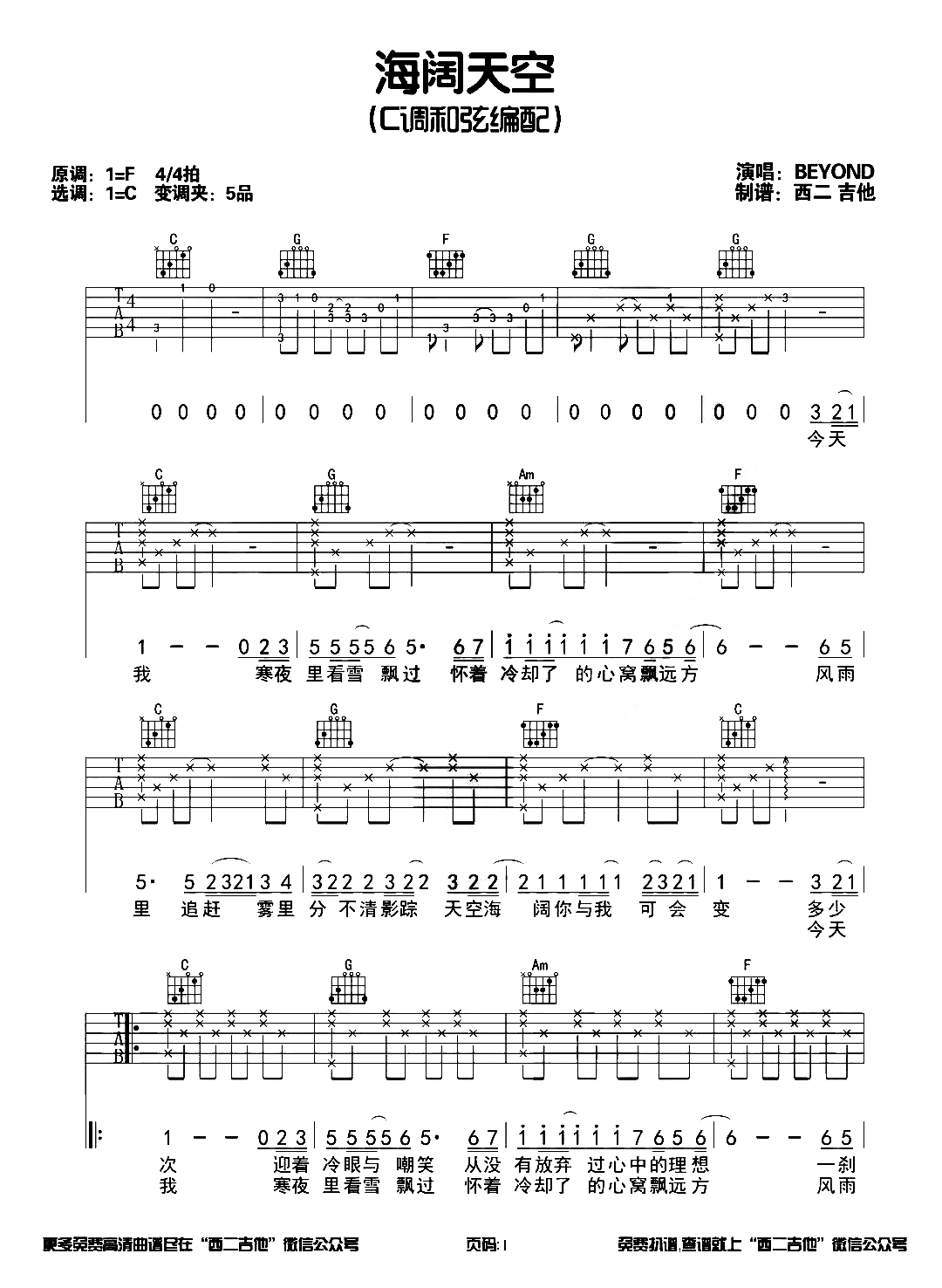 曲谱介绍: Beyond《海阔天空》吉他谱,山山吉他制谱,选用C调,《海阔天空》六线谱,共三张高清图片谱例,包含完整的前奏,弹唱原调变调夹可夹5品,按原版编配85%接近原版,随谱附《海阔天空》的吉他弹唱演示视频,可参考结合练习,弹唱难度初级简单。 《海阔天空》吉他弹唱演示视频