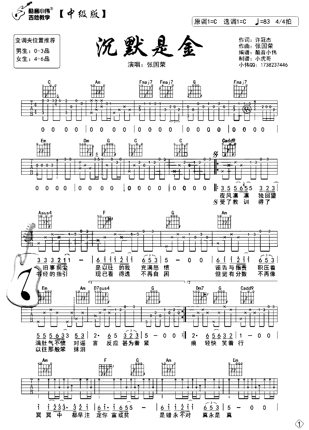 曲谱介绍: 张国荣《沉默是金》吉他谱,由酷音小伟制谱,选用C调指法,建议男生变调夹0-3品,女生4-6品,速度83BPM,节奏4/4拍,难度中级整体较简单,随谱可参考《沉默是金》吉他演示+教学视频,跟随小伟老师的一起练习。 《沉默是金》吉他弹唱演示+教学视频