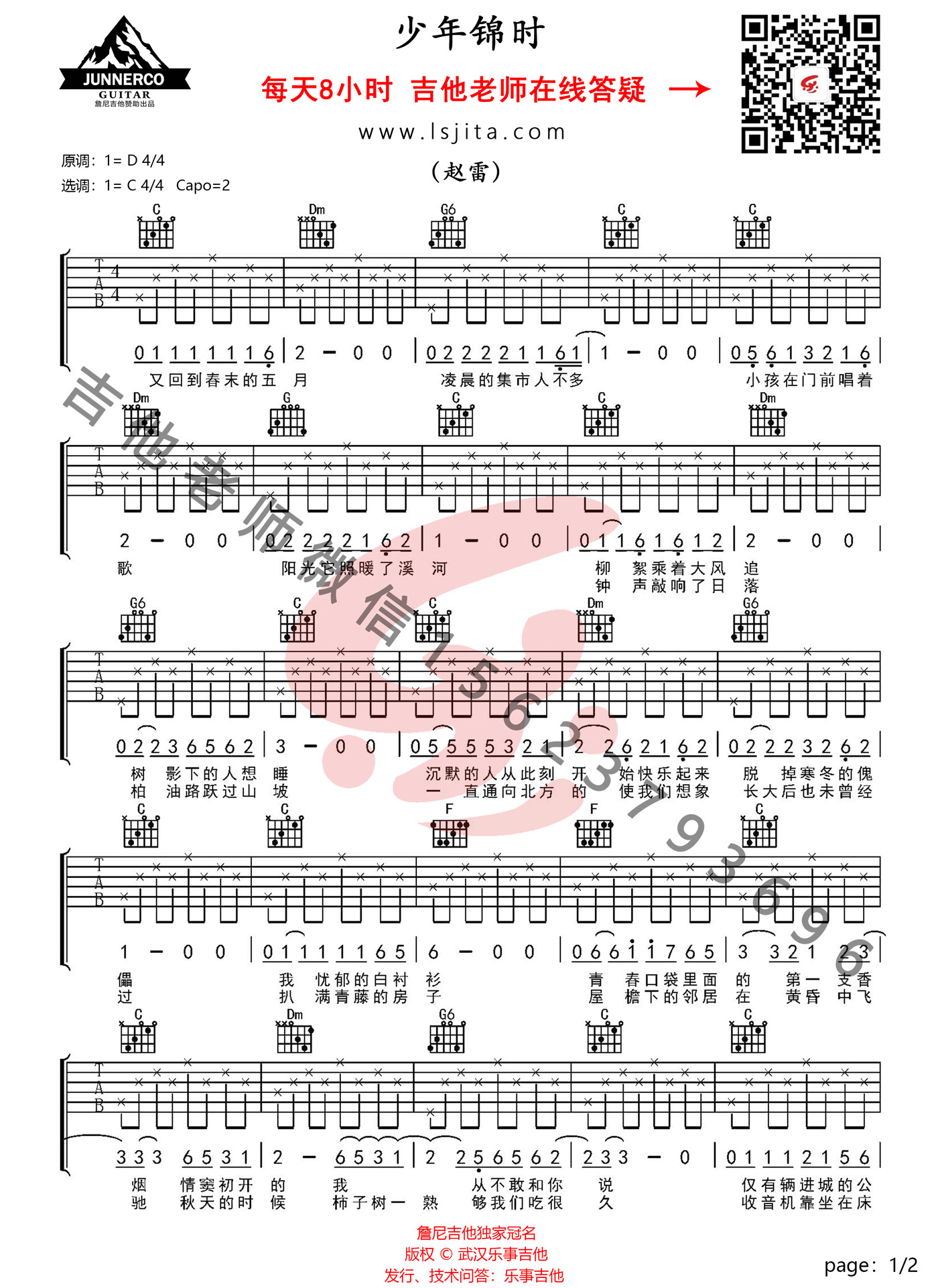 曲谱介绍: 此版本的曲谱来源于武汉乐事吉他扒谱制谱,歌曲原调为D调,这里采用C调指法进行编配,演唱时夹变调夹2品回到原调。全曲采用T3231323的基础节奏型编配,非常简单,不懂的可以参考吉他弹唱教学视频。 《少年锦时》吉他谱_赵雷_C调简单版六线谱_吉他弹唱教学视频:   吉他弹唱演示及视频教学 《少年锦时》吉他谱_赵雷_C调简单版六线谱_吉他弹唱高清图片谱1: