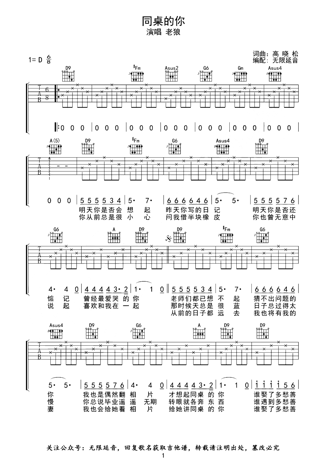 同桌的你吉他谱 - 老狼 - D调吉他弹唱谱