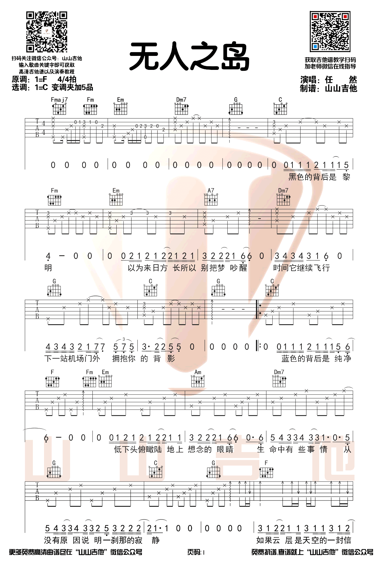 曲谱介绍: 任然《无人之岛》吉他弹唱谱,采用C调指法编配原版,共有3张高清图谱。