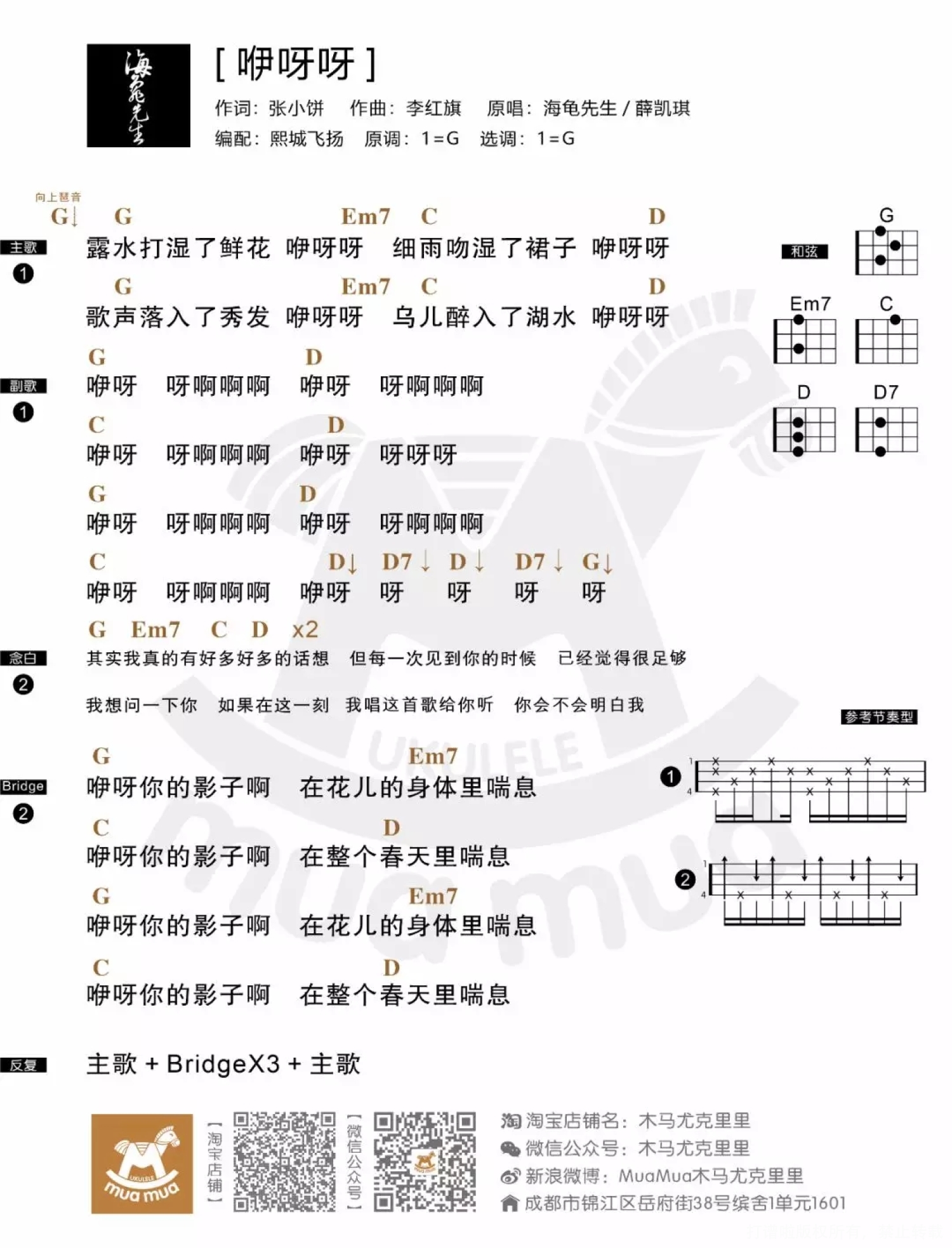 曲谱介绍: 在本周六播出的《乐队的夏天》第7期竞演中,小编特别喜欢的海龟先生乐队在这期主题为“女神合作赛”的比赛中邀请到了香港女歌手薛凯琪,他们一起合唱了一首《咿呀呀》。 妈呀!这是一首什么神仙合唱啊,把小编的耳朵都听怀孕了,两端平行的复调旋律在李红旗和薛凯琪的演绎下是那么地诗意动人。 这首曲子获得了全场倒数的分数,专业乐迷和评委们生生把《乐队的夏天》吵成了《奇葩说》辩论现场! 简单回顾一下: 这期节目的赛制是乐队和女神合作演出,海龟先生乐队和薛凯琪联手,唱了一首和前几期有所区别的歌。 表演之后,马东抛出问题:担不担心因为迁就薛凯琪,降低海龟先生原本的表现力。 贝斯手蒋晗回答:“不重要嘛,这本来就是女神赛,一切为女神服务。”分数公布,301票,全场倒数。面对这个结果,大张伟挠头,吴青峰皱眉。 镜头切到乐队,旅行团、盘尼西林和Mr Woohoo的成员也直说:不应该,为什么,这歌真的好听。 由乐评人和行业观察者组成的专业乐迷,干脆争了起来。 奇葩影像创始人丁太升不投票的理由是:为了迁就合作者而牺牲了太多原本属于乐队的气质和光芒。 轻松调频DJ李源的评价是:基底是一首民谣的歌曲,有点不上不下。 可坏蛋调频主理人王硕不同意。他说虽然自己是旅行团乐队的路人粉,但这期他们破了圈,特别好。 后面还有大张伟和刘阳子的激烈互怼,在这里就告一段落了,音乐审美很主观,乐评人从来也就是谁都能干的事儿,什么是专业的乐评人,简单点吧,把个人喜好放一边,从音乐理性角度分析作品的,但是这不重要,说你认同观点,和你有同样音乐审美的乐评人在你眼中就是正确的。 所以如果你也和小编一样,喜欢海龟先生和薛凯琪合唱的这首《咿呀呀》,就把谱子拿去弹!   咿呀呀尤克里里弹唱谱
