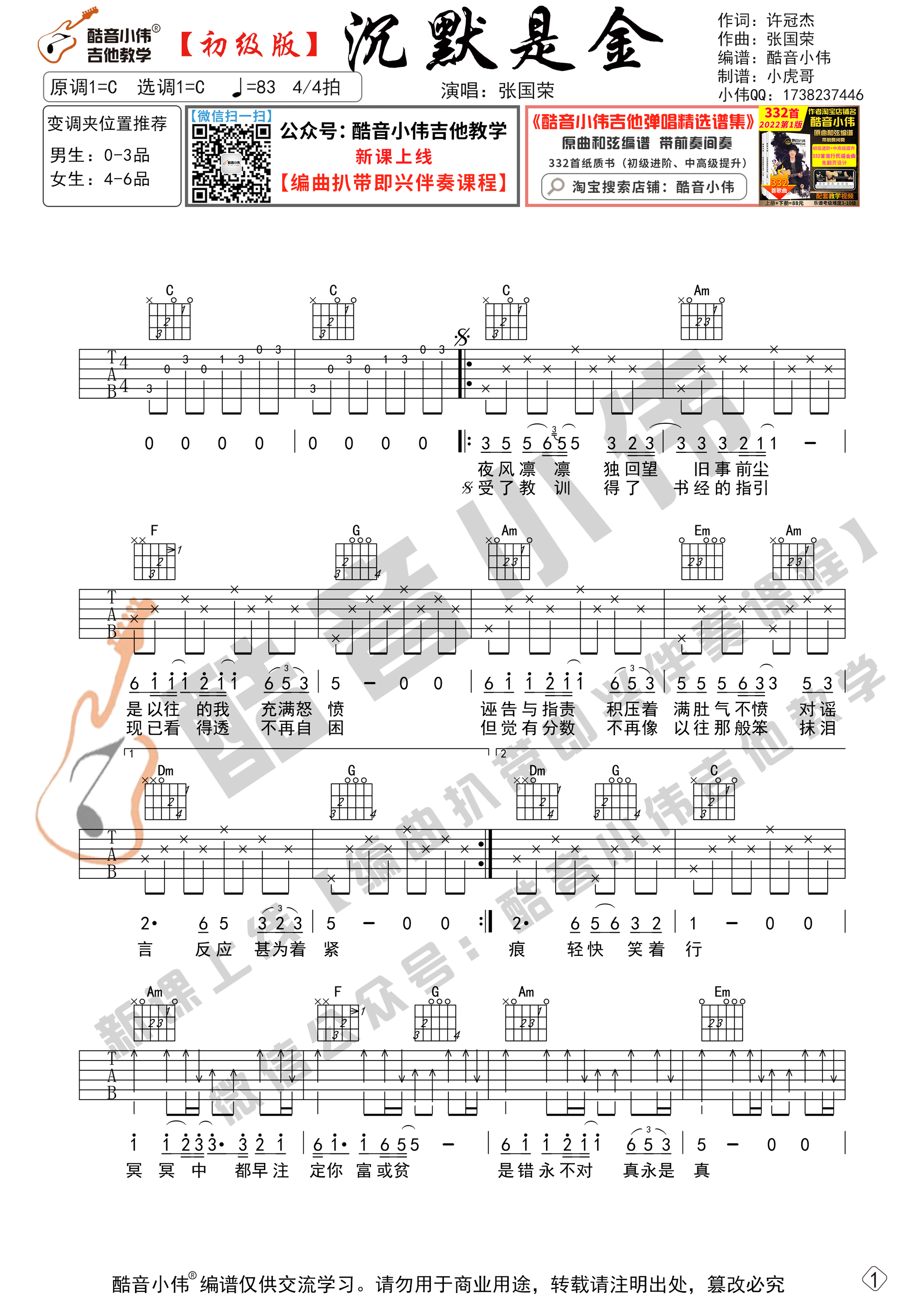 曲谱介绍: 曲谱适合初学者练习,选用C调指法,变调夹的位子可以根据我的推荐来选择。使用分解+扫弦伴奏型,先弹奏会曲谱,再清唱会,然后弹唱结合一起练习。《沉默是金》这首歌可以说是一首人生励志歌曲,通过歌词句句唱出了现实社会中的我们,在面对生活中的挫折,谣言,困惑和嘲笑时,都要保持乐观的心态,有的时候保持沉默是面对人生最好的处理方式。