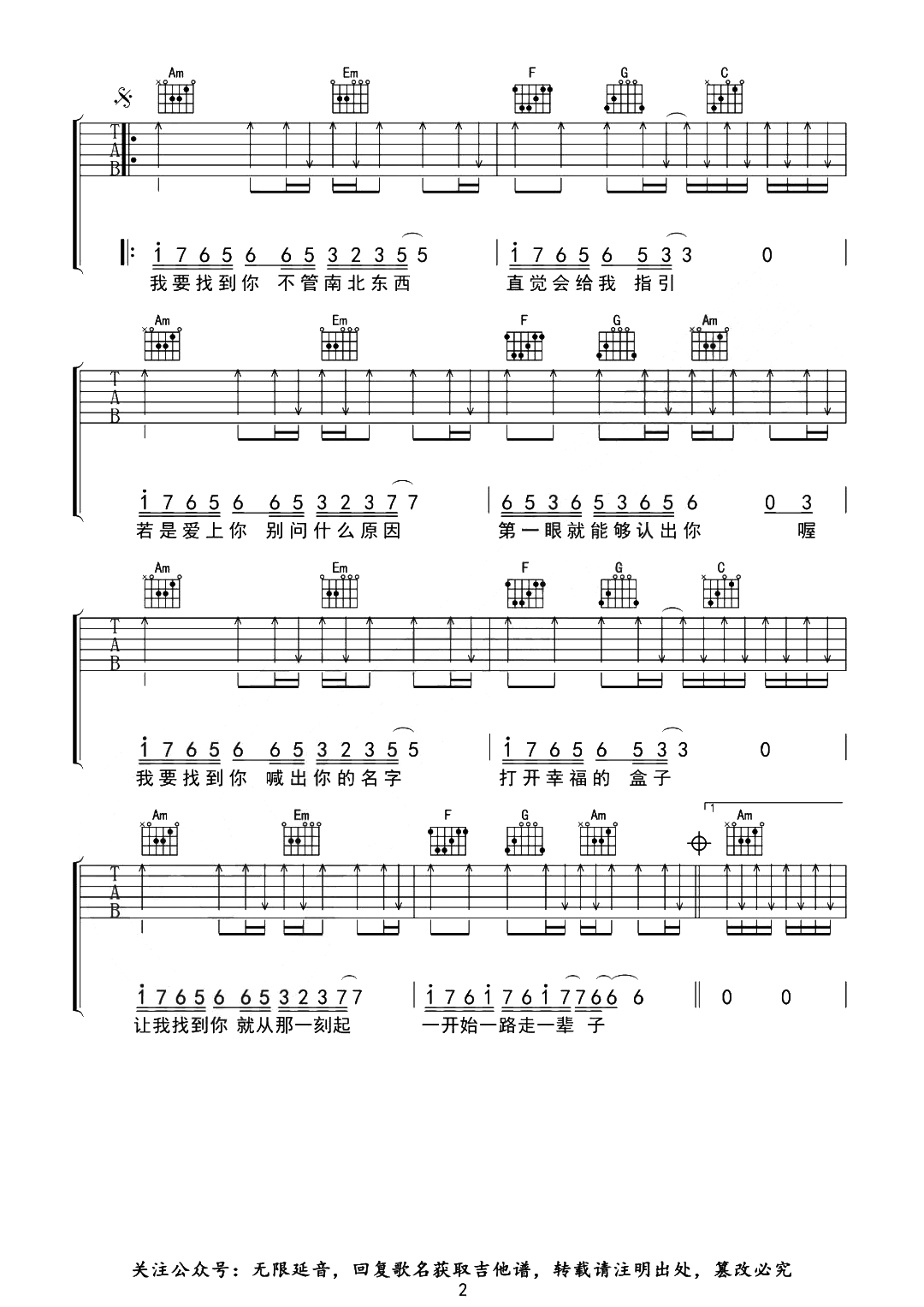 曲谱介绍: zic子晨/陈明《我要找到你》吉他谱_C调精编版吉他谱分享,《我要找到你》这是陈明原唱的一首老歌,子晨全新的翻唱,也让这首歌曲注入了全新的情绪,当拥有远比失去更多的时候,我们永远不懂珍惜,当失去已成为定局的时候,我们才知道无论在哪里都要找到你。 zic子晨/陈明《我要找到你》吉他谱,共三张高清图片谱,由无限延音编配制谱,选用C调指法,根据实际情况调整变调夹位置,节奏4/4拍,弹唱难度中级。