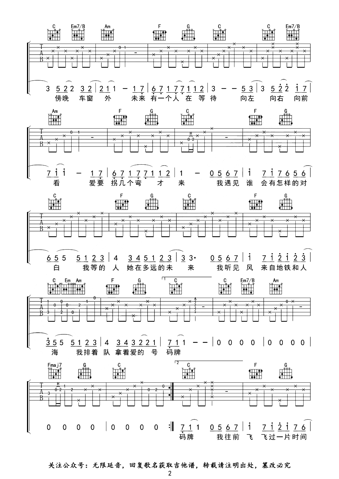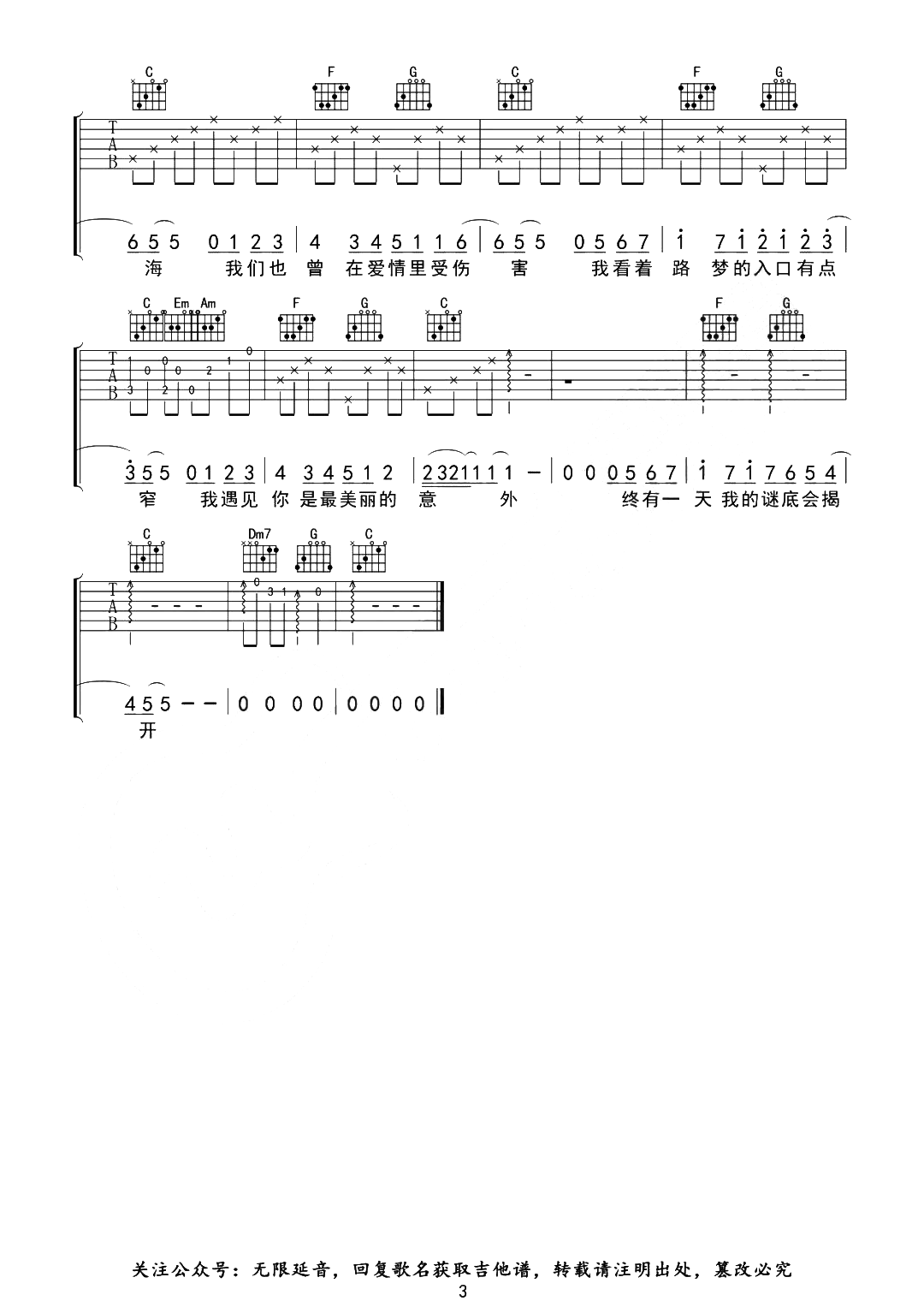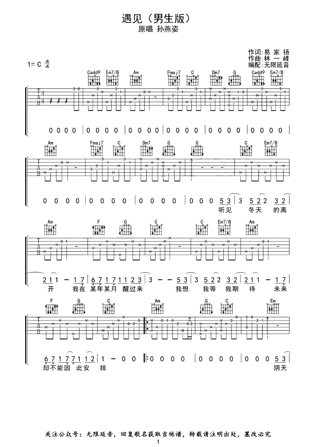 曲谱介绍: 孙燕姿《遇见》吉他谱_《遇见》C调精编六线谱(男生版)分享,《遇见》这首歌可以算是孙燕姿演唱生涯的里程碑,歌曲曲调轻缓舒情,配合舒缓柔和的歌声,让听众能够瞬间融入到静谧的意境之中,歌词的语境呈现出因为相遇与离别而染上了淡淡的忧伤,听来却能直击心灵深处! 孙燕姿《遇见》吉他谱,共三张高清图片谱,由无限延音制谱,选用C调,可不用变调夹,也可将变调夹调至1-3品,根据嗓音选择,包含前奏,难度初级简单。