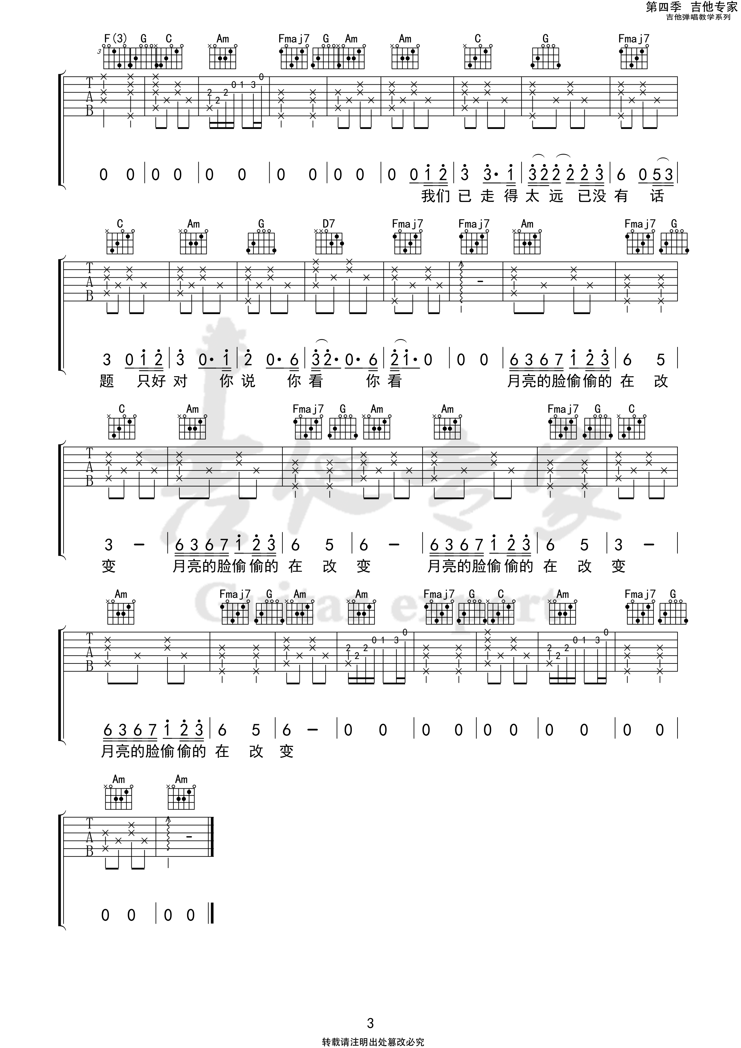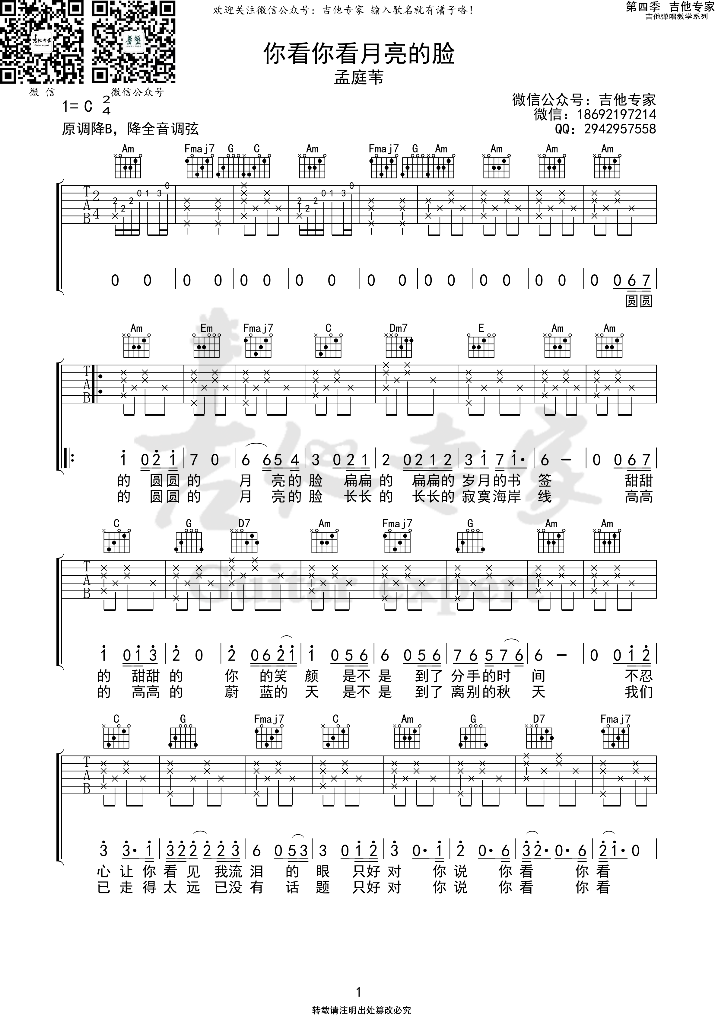 曲谱介绍: 吉他专家《你看你看月亮的脸》吉他弹唱谱,采用C调指法编配,共有3张高清图谱。
