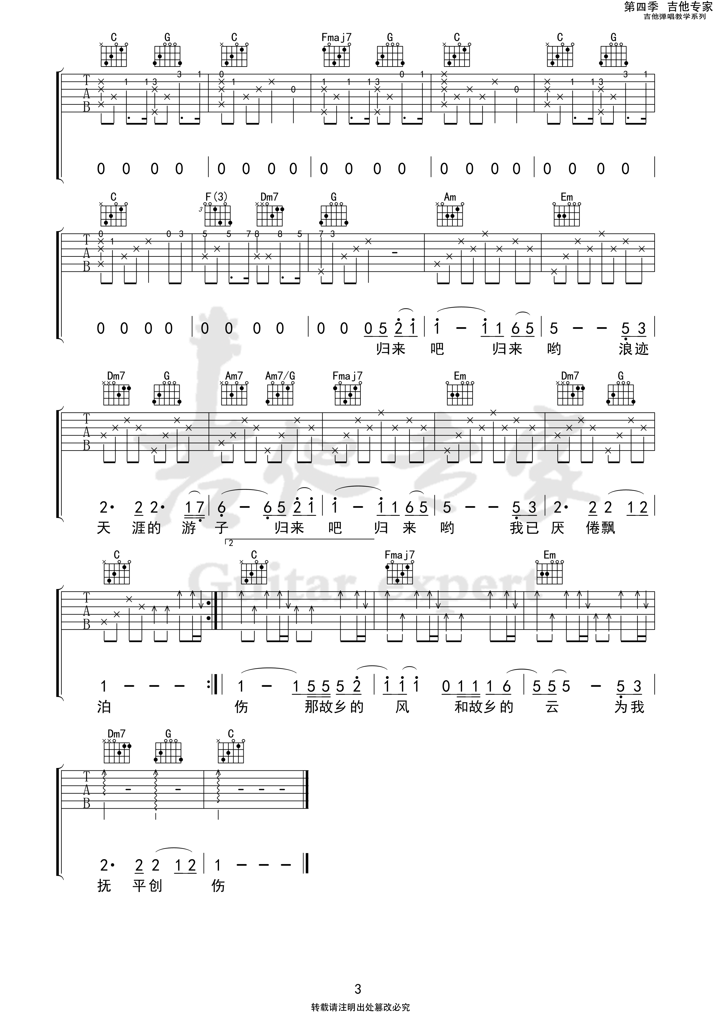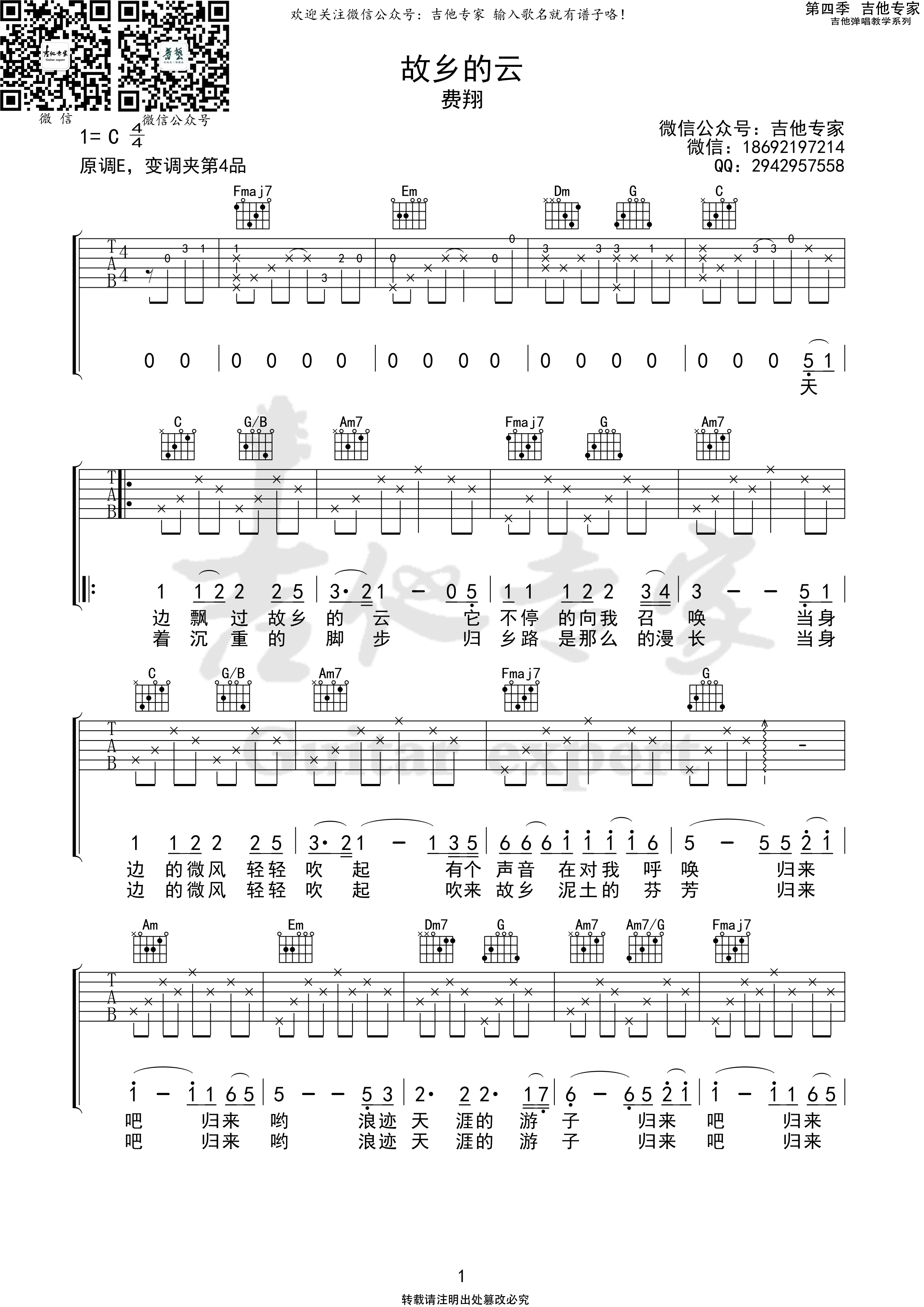 曲谱介绍: 费翔《故乡的云》吉他弹唱谱,采用C调指法编配,共有3张高清图谱。