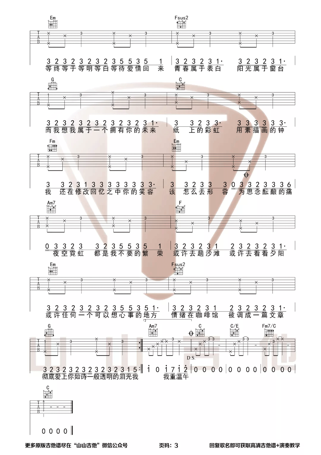 曲谱介绍: 周杰伦《手写的从前》吉他弹唱谱,采用C调指法编配原版,共有3张高清图谱。