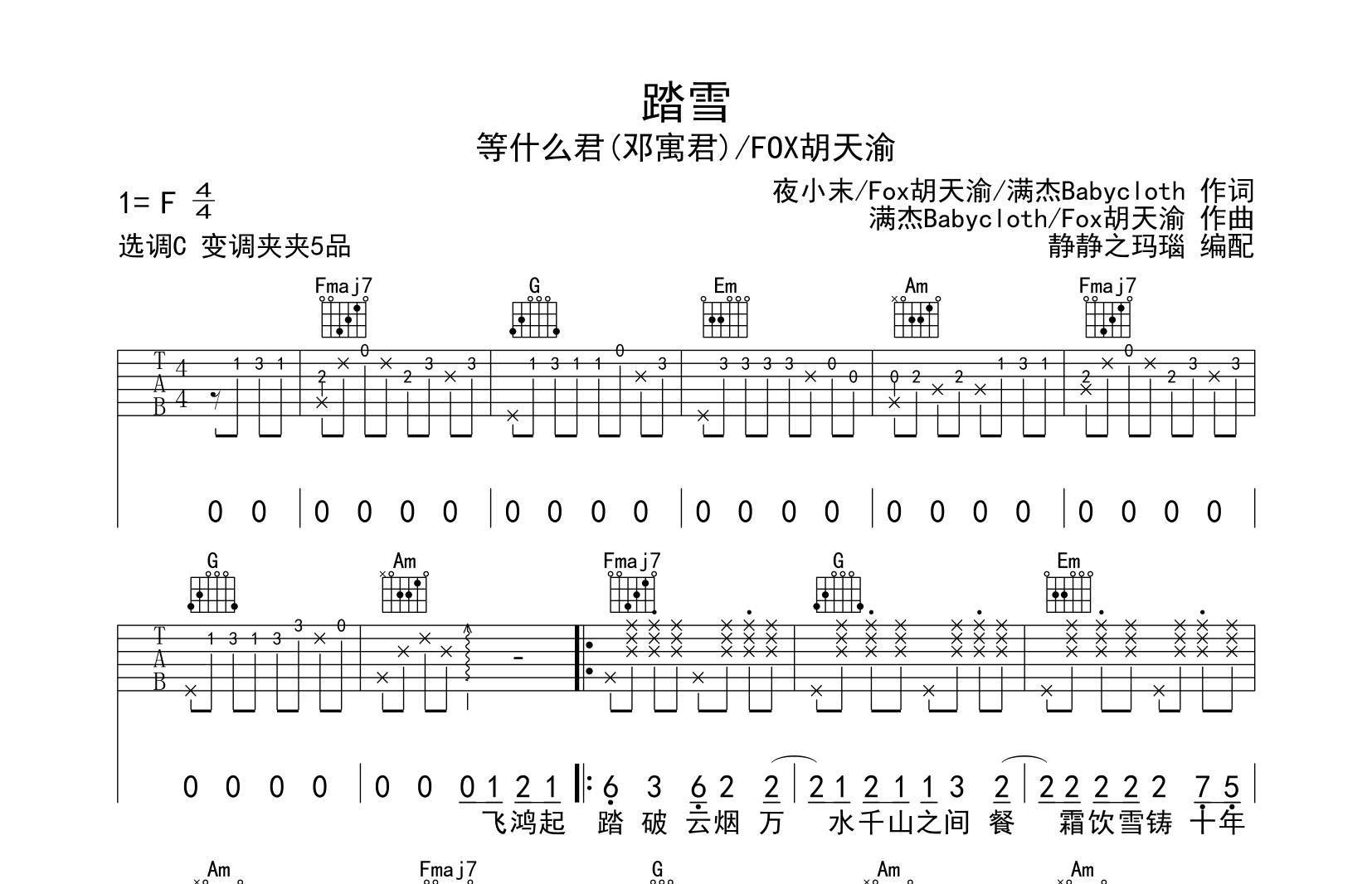 曲谱介绍: 踏雪吉他谱,等什么君/FOX胡天渝演唱,选用C调指法编配,《踏雪》吉他弹唱谱,节奏为4/4拍,速度为100拍每分钟,弹唱建议变调夹夹5品,也可以根据个人嗓音找到一个舒服的位置,难度初级。