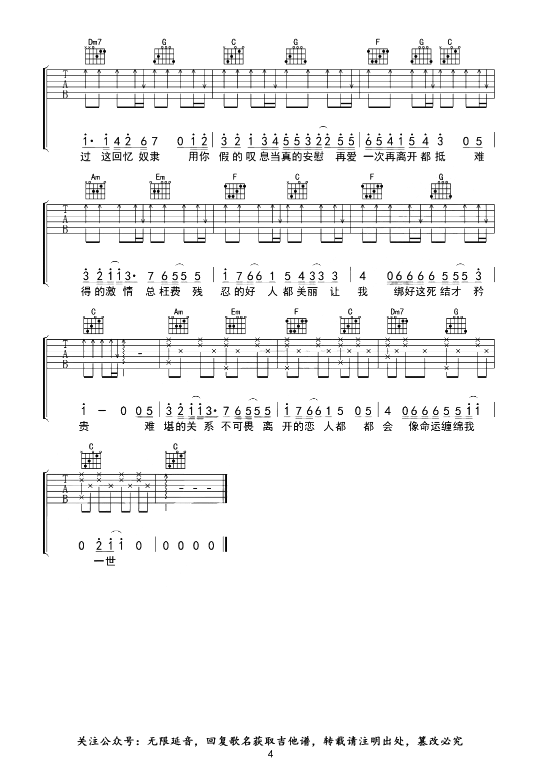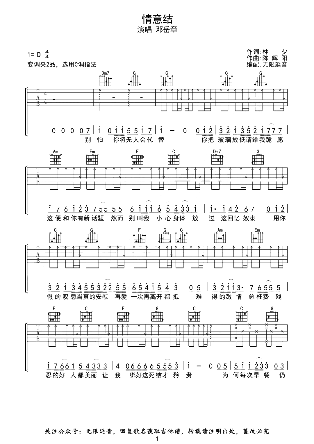 曲谱介绍: 邓岳章《情意结》吉他谱,无限延音制谱,选用C调,《情意结》吉他弹唱谱,共四张高清图片谱,变调夹建议二品弹唱原调D调,主要以扫弦节奏和半分解和弦为主,弹唱难度初级简单。