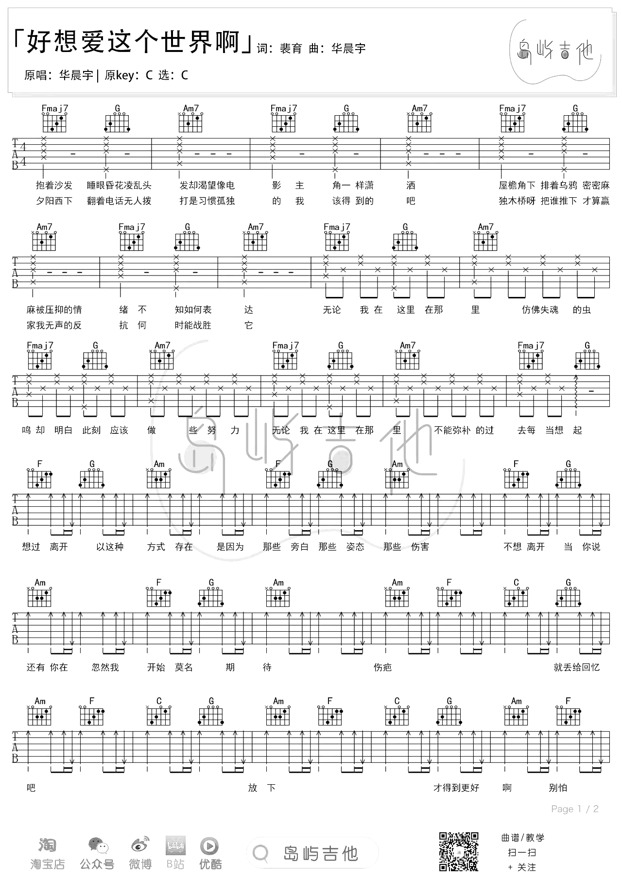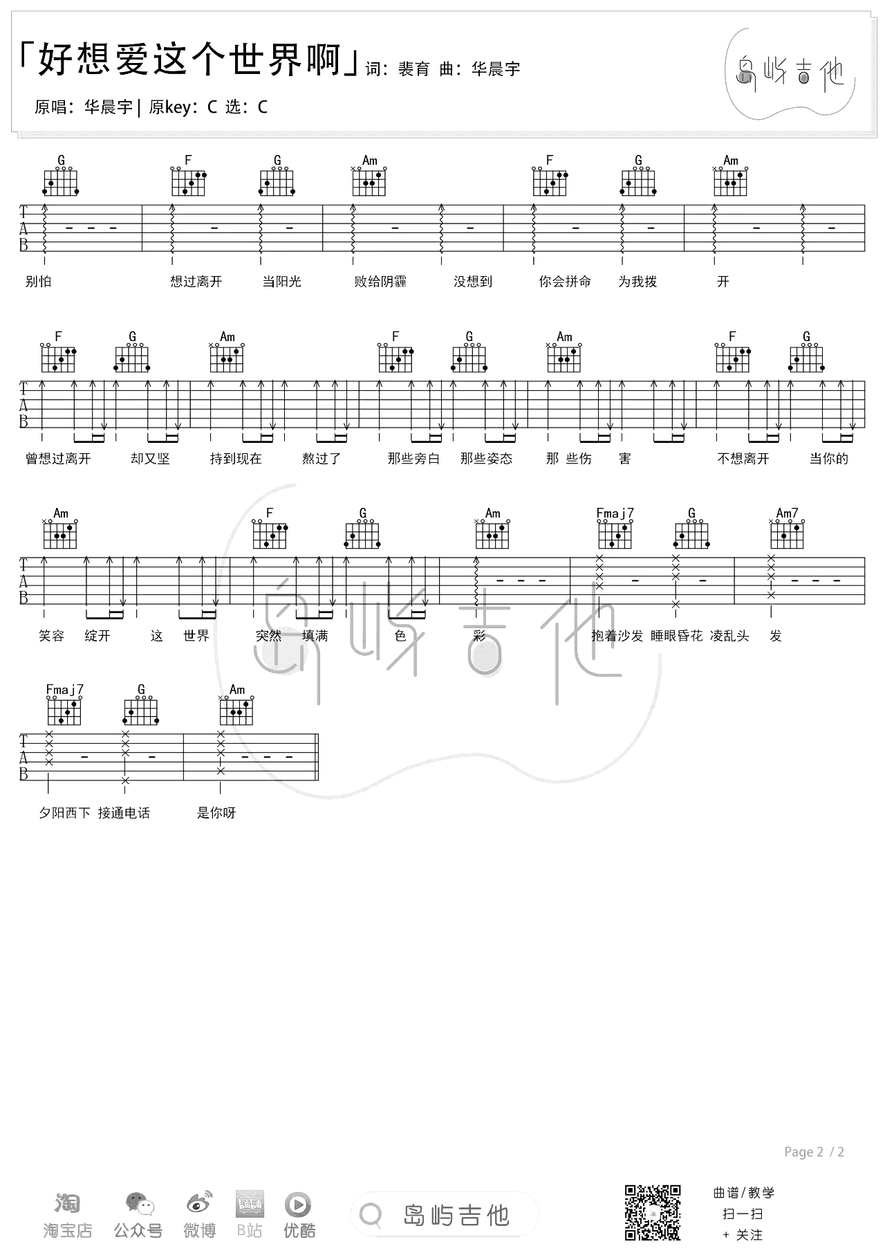 曲谱介绍: 华晨宇的一首以温柔对抗黑暗的治愈歌曲,好想爱这个世界啊吉他谱,选用原调C调指法编配,两张图片六线谱。随谱附上弹唱演示和教学视频,琴友们可以参照老师的讲解示范学习。