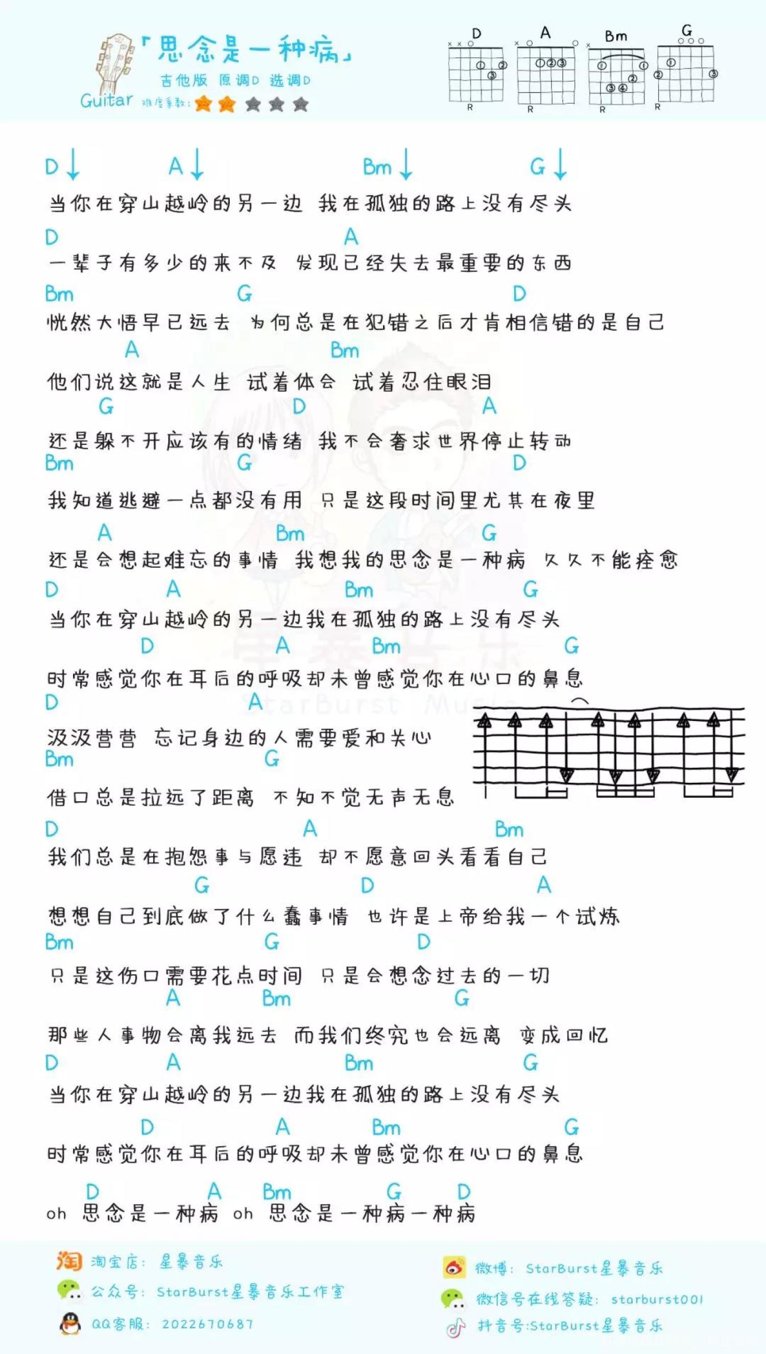 曲谱介绍: 〈思念是一种病〉原曲由歌手齐秦创作并演唱的,1989年发行于专辑「纪念日」。由齐秦的虹乐队作词作曲,后来王祖贤、蔡健雅、张震岳等均有翻唱。 吉他演示视频 尤克里里教学视频 尤克里里曲谱 吉他曲谱